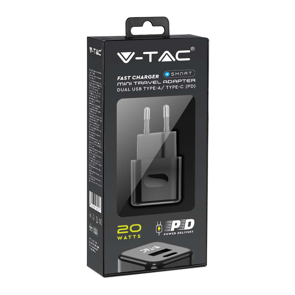 Adapter von V-TAC, Modell VT-5320-B, mit einer Leistung von 20W. Dieser Adapter eignet sich für den Einsatz mit verschiedenen Geräten. Er verfügt über zwei USB-Anschlüsse, einen Typ-A und einen Typ-C, mit einer maximalen Ausgangsleistung von 20W. Die Abmessungen betragen 70 mm x 160 mm x 35 mm und das Gewicht liegt bei 0,08 kg. Ideal für Smartphones, Tablets und Laptops.