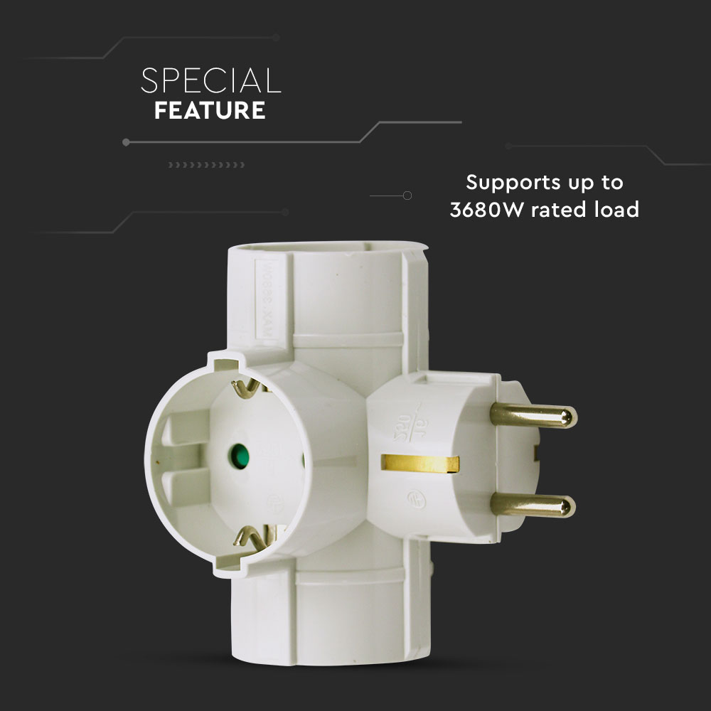 Adapter von V-TAC, Modell VT-1012-3, für den Einsatz in Haushalten, Büros und auf Reisen. Der Adapter hat eine maximale Belastung von 3680W und ist für eine Eingangsspannung von AC 250V, 16A ausgelegt. Er zeichnet sich durch seine einfache Handhabung und Portabilität aus. Die Abmessungen betragen 60mm x 90mm x 70mm bei einem Gewicht von 0,1kg. Geeignet für den Einsatz in Hotels und Ausstellungsräumen.