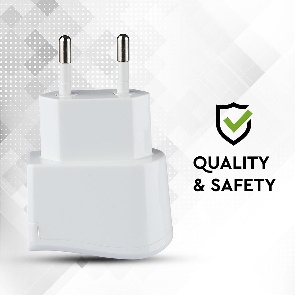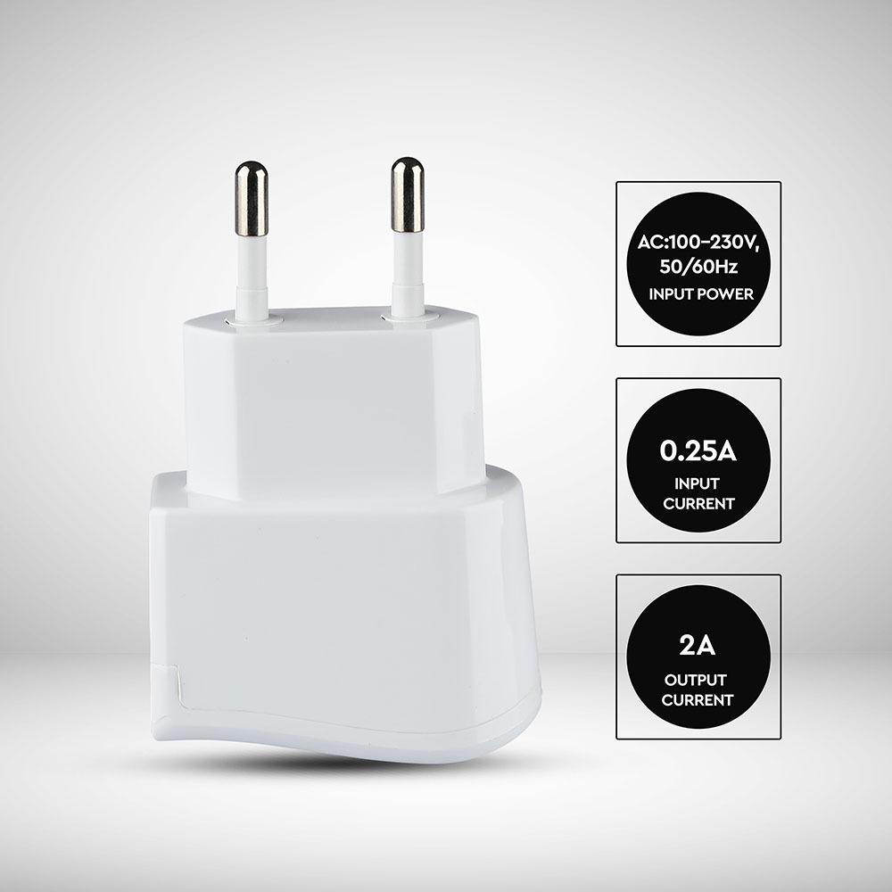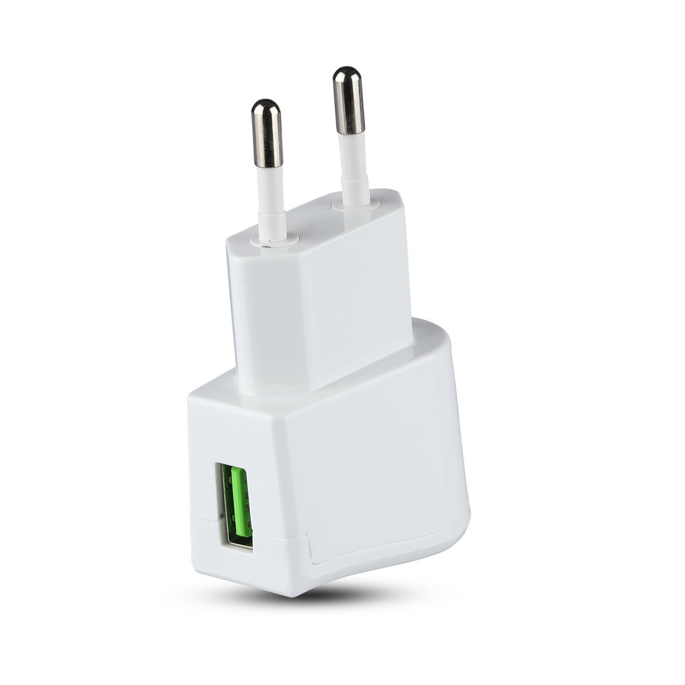 Adapter von V-TAC, Modell VT-1024-W. Dieser USB-Adapter bietet eine Ausgangsleistung von DC 5V (2000mA) und ist für den Einsatz in Haushalten, Büros und auf Reisen geeignet. Er unterstützt eine Eingangsspannung von AC 100-230V bei 50/60Hz. Mit einem kompakten Design von 30mm Länge und einem Gewicht von 0,05kg ist er tragbar und einfach zu verwenden. Der Adapter ist mit einem USB-Ausgang ausgestattet und eignet sich für verschiedene Anwendungen.