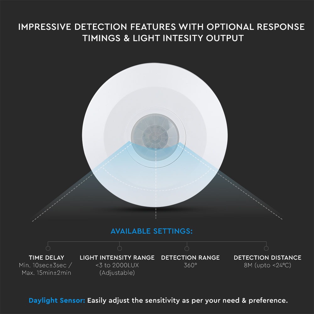 Bewegungsmelder von V-TAC, Modell VT-8027-W, geeignet für die Oberflächenmontage. Der Infrarotsensor kann Wärmequellen erkennen und bietet eine hohe Funktionalität. Er verfügt über eine einstellbare Zeitverzögerung, Umgebungslicht- und Erkennungsdistanz für vielseitige Anwendungen. Mit einer Lebensdauer von 5 Jahren und hochwertigen Empfängern gewährleistet er sofortige Funktionalität. Maße: 120 mm x 35 mm x 124 mm, Gewicht: 0,14 kg.