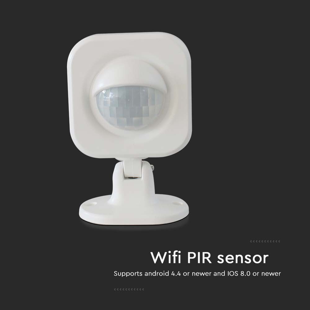 Bewegungsmelder von V-TAC, Modell VT-5176. Dieser WLAN PIR Sensor ist für die intelligente Steuerung von Beleuchtungssystemen konzipiert. Er bietet eine einfache Installation und lässt sich mit der V-TAC Smart Light App sowie Alexa und Google Home verbinden. Der Sensor arbeitet mit einer Standby-Stromaufnahme von 40 µA und unterstützt WLAN 2,4 GHz. Maße: 60 mm x 35 mm x 85 mm, Gewicht: 0,08 kg. Einfache Installation und Pairing mit der App.