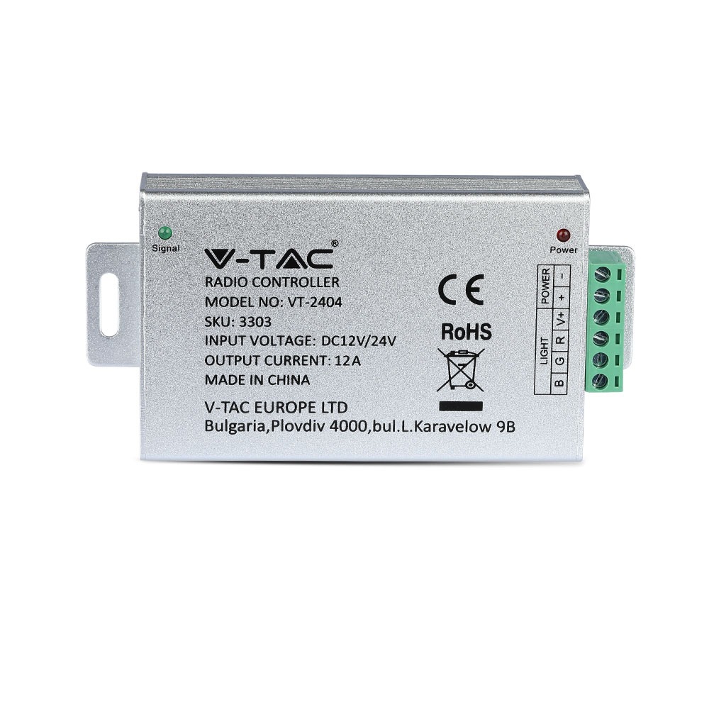 Controller von V-TAC, Modell VT-2404, für LED Streifen mit einer maximalen Stromstärke von 4A pro Kanal. Der Controller verfügt über drei Ausgangskanäle und ermöglicht verschiedene Lichtstile und Farbwechsel. Die Lebensdauer beträgt 20.000 Stunden. Die Abmessungen sind 135mm x 80mm x 55mm bei einem Gewicht von 0,17kg. Kompatibel mit V-TAC Streifenleuchten.
