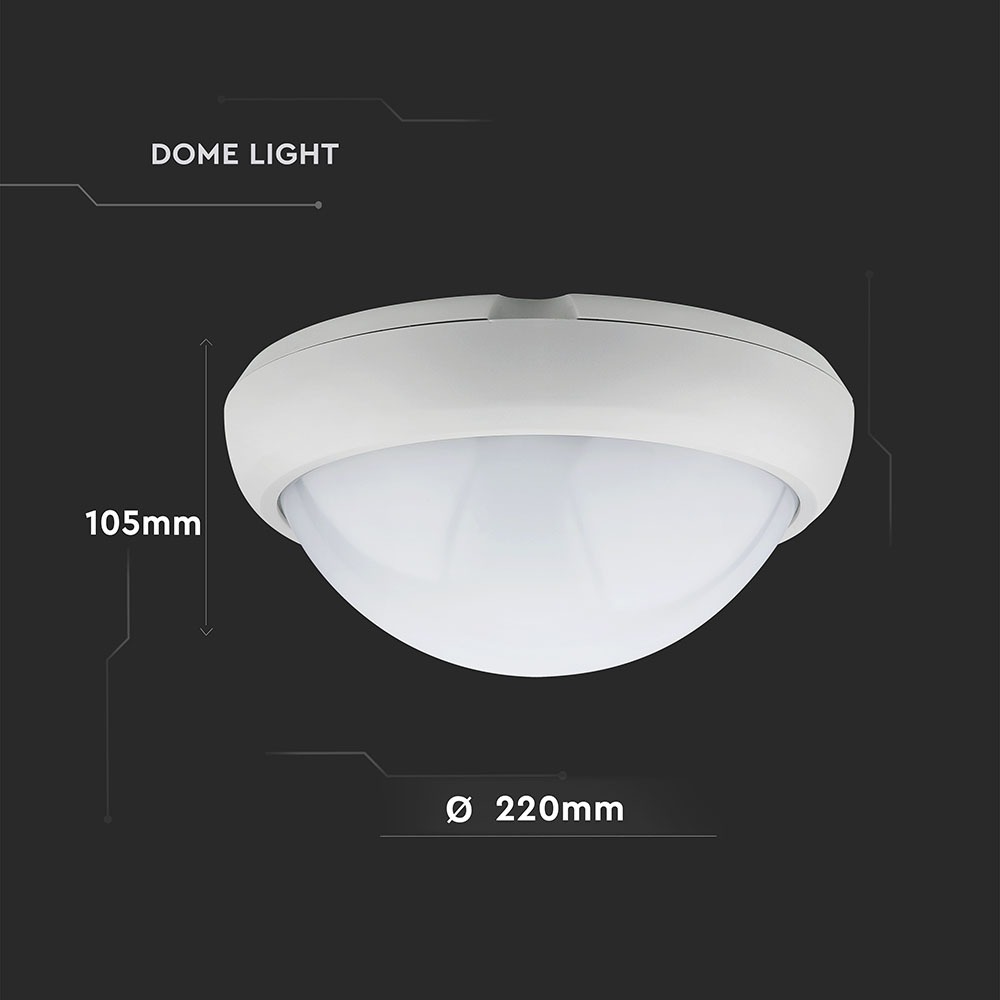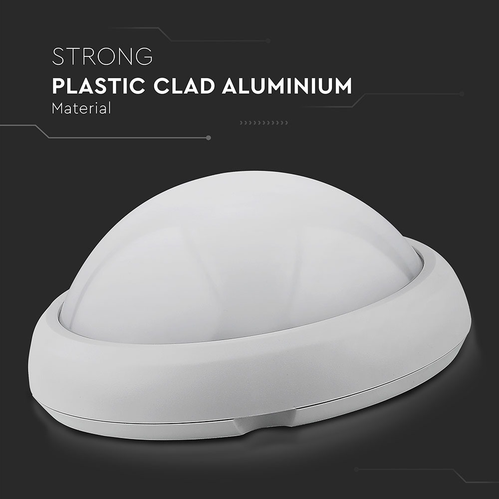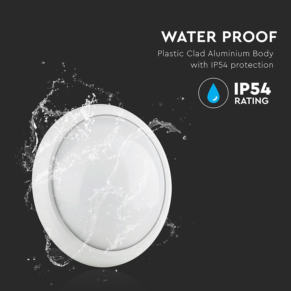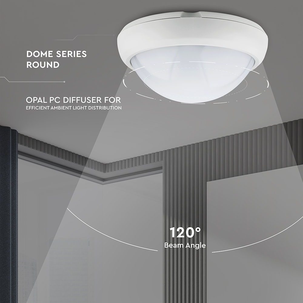 Deckenleuchte von V-TAC, Modell VT-8015-W, mit einer Leistung von 12 Watt, geeignet für verschiedene Anwendungen. Sie bietet eine Lichtstärke von 840 Lumen, einen Farbwiedergabeindex von über 70 und einen Abstrahlwinkel von 120°. Die Lebensdauer beträgt 20.000 Stunden, was für eine hohe Qualität spricht. Die Montage erfolgt auf der Oberfläche. Die Leuchte ist robust und bietet einen IP54 Schutz gegen das Eindringen von Staub und Spritzwasser.