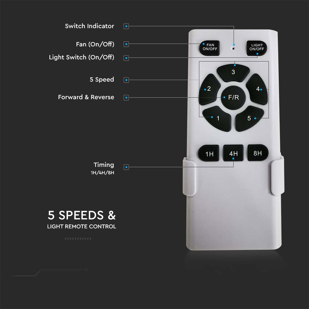 Deckenventilator von V-TAC, Modell VT-6054-4, mit einer Leistung von 35 Watt. Dieser dekorative Deckenventilator ist ideal für den Einsatz in Restaurants, Wohnzimmern, Schlafzimmern und Büros. Der Ventilator verfügt über einen DC-Motor mit Vorwärts- und Rückwärtsfunktion sowie 4 MDF-Blätter. Die Maße betragen 600 mm in der Länge und das Gewicht liegt bei 7,6 kg. Der Ventilator ist für eine maximale tägliche Nutzung von 10-12 Stunden geeignet, um die Garantie nicht zu gefährden.
