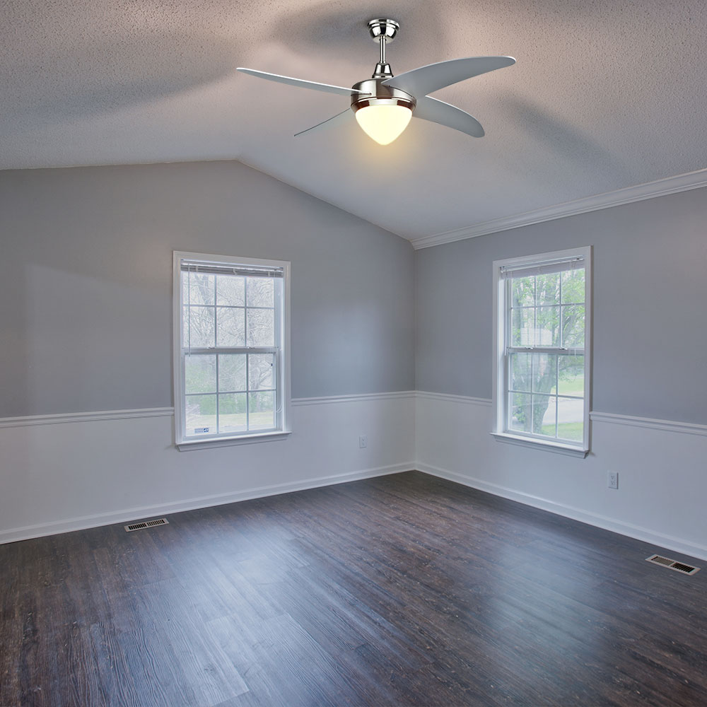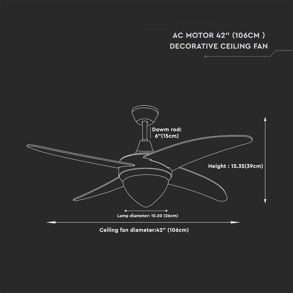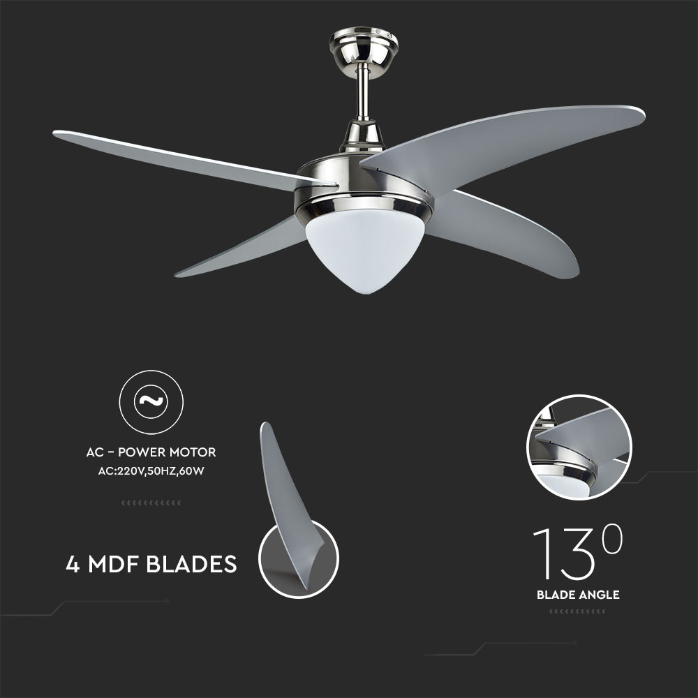 Deckenventilator von V-TAC, Modell VT-6043-4, mit einer Leistung von 60W. Der Ventilator verfügt über eine integrierte 15W 3IN1 CCT LED-Leuchte. Er bietet eine hohe Luftzirkulation mit 220±10 Umdrehungen pro Minute und ist für den Einsatz in Restaurants, Wohnräumen, Schlafzimmern und Büros geeignet. Der Ventilator hat einen Durchmesser von 260mm und wiegt 2,3kg. Er ist mit einem RF-Controller ausgestattet und bietet drei Geschwindigkeitsstufen sowie eine Vorwärts- und Rückwärtsfunktion.