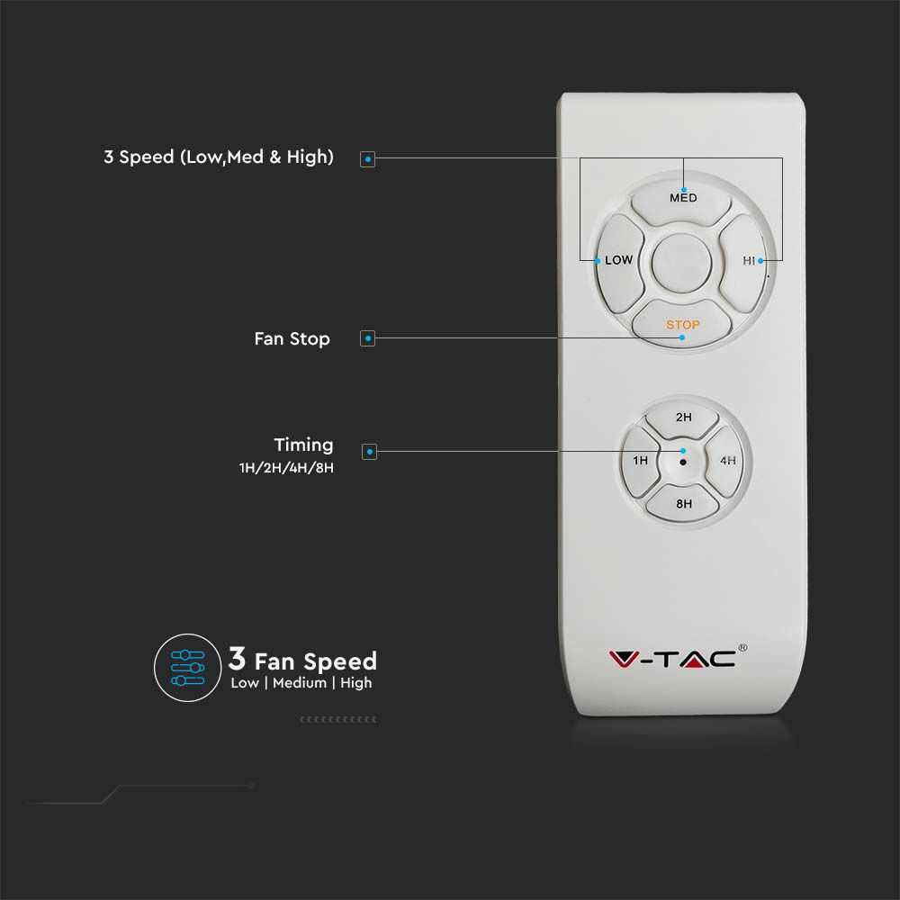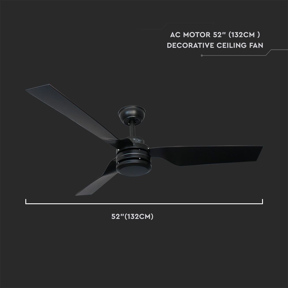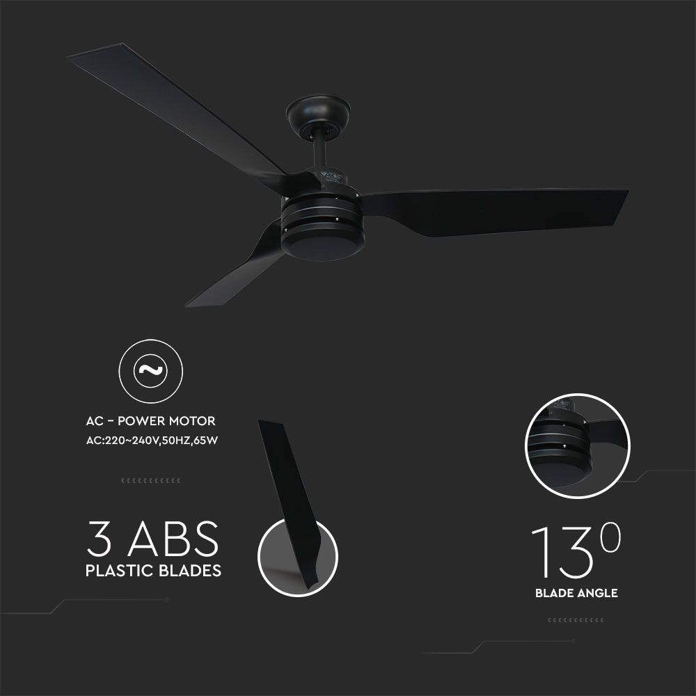 Deckenventilator von V-TAC, Modell VT-6552-3, mit einer Leistung von 65W. Dieser dekorative Deckenventilator eignet sich für verschiedene Anwendungen wie Restaurants, Wohnzimmer, Schlafzimmer und Büros. Der leistungsstarke Wechselstrommotor hat eine Größe von 172x20mm und ein Gewicht von 3,85kg. Die drei Rotorblätter aus ABS-Kunststoff haben einen Blattwinkel von 13°. Der Ventilator bietet drei Geschwindigkeitsstufen und kann über eine Fernbedienung gesteuert werden.