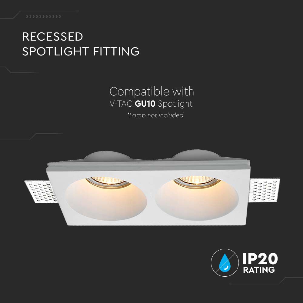 Einbauleuchte von V-TAC, Modell VT-11002, geeignet für 2XGU10 Lampen. Diese Leuchte bietet eine elegante weiße Oberfläche und ist ideal für den Einsatz in Hotels, Wohnbereichen, Restaurants und gewerblicher Beleuchtung. Die Leuchte ist aus robustem und langlebigem Gips gefertigt. Mit einem Gewicht von 0,5 kg und einer Abmessung von 215 mm x 125 mm x 55 mm ist sie für den Einbau geeignet. Kompatibel mit 2XGU10 Lampen (Lampeneinheit nicht enthalten).