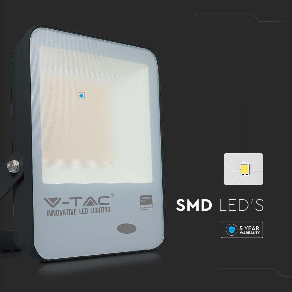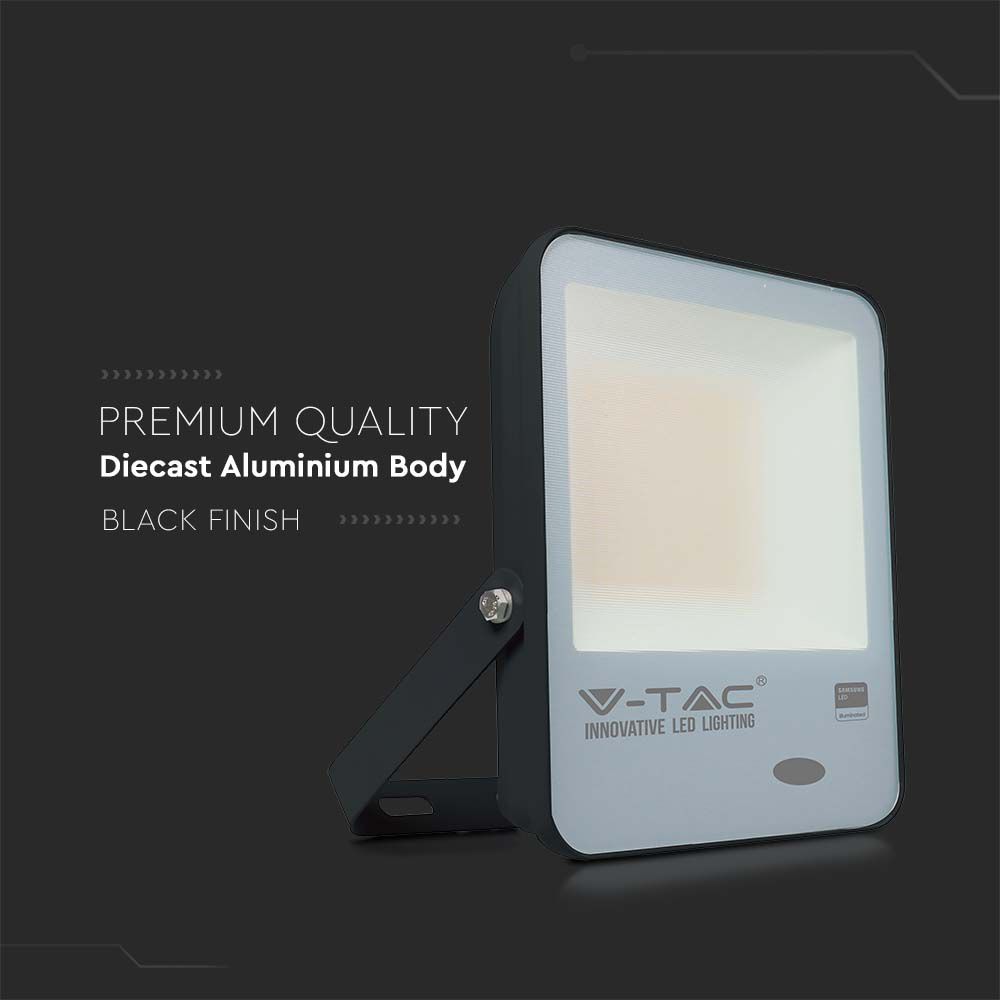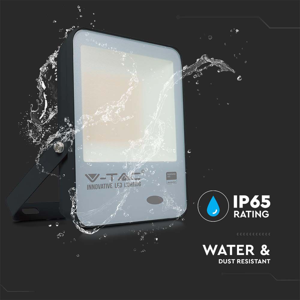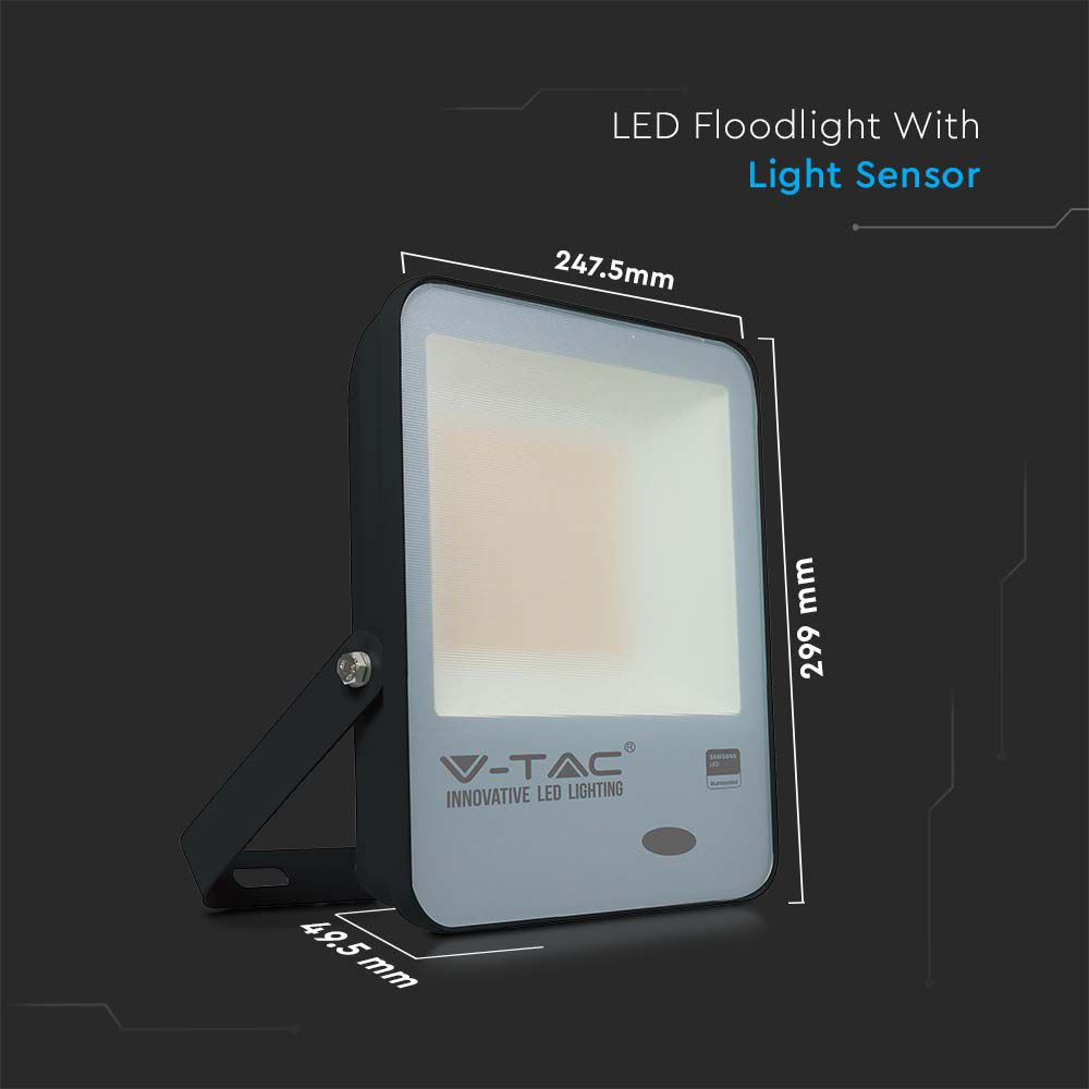 Flutlicht von V-TAC, Modell VT-117, mit einer Leistung von 100 Watt. Es bietet eine Lichtausbeute von 10000 Lumen und einen Lichtstrom von 100 lm/W bei einer Farbtemperatur von 6500K. Die Lebensdauer beträgt 25.000 Stunden und das Gerät ist mit einem IP65-Schutz ausgestattet, was es ideal für den Außenbereich macht. Die Maße betragen 252 mm x 54 mm x 304 mm und das Gewicht liegt bei 1,72 kg. Das Flutlicht ist mit einem hochwertigen Lichtsensor ausgestattet, der automatisch bei natürlichem Licht über 140 Lux abschaltet und darunter einschaltet.