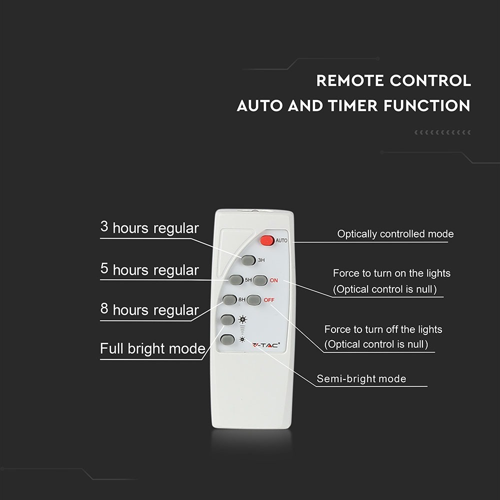 Flutlicht von V-TAC, Modell VT-100W, mit einer Leistung von 100W, ideal für den Außenbereich. Das Licht liefert 2450 Lumen bei einer Farbtemperatur von 4000K und einem Abstrahlwinkel von 120°. Die Lebensdauer beträgt 20.000 Stunden und das Produkt ist nach IP65 geschützt. Die Maße betragen 120 mm x 370 mm x 590 mm und das Gewicht liegt bei 5,469 kg. Flexible Installation mit einem Solarpanel und einer Kabellänge von 5 Metern.