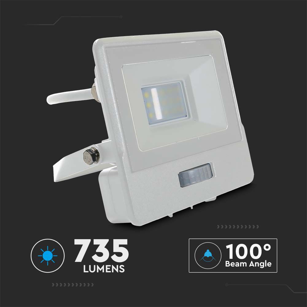 Flutlicht von V-TAC, Modell VT-118S-1-W, mit einer Leistung von 10W, ideal für Außenanwendungen. Es bietet eine Lichtausbeute von 735 Lumen, einen Farbwiedergabeindex von über 80 und einen Abstrahlwinkel von 100°. Die Lebensdauer beträgt 25.000 Stunden und das Produkt ist mit einem PIR-Sensor ausgestattet. Die Abmessungen betragen 138 mm x 63 mm x 118 mm und das Gewicht liegt bei 0,4 kg. Geeignet für die Montage in Höhen von 1,8 bis 2,5 Metern. Hohe Effizienz durch LED-Chips von Samsung und korrosionsbeständiges Gehäuse aus Druckguss-Aluminium.
