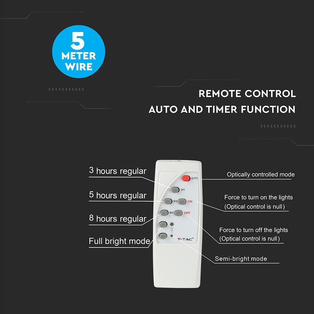 Flutlicht von V-TAC, Modell VT-25W, 25W Leistung, ideal für Außenbereiche. Das Flutlicht bietet eine Lichtstärke von 550 Lumen und eine Farbtemperatur von 6000K. Mit einer Lebensdauer von 20.000 Stunden und einer IP65 Schutzart ist es für den Außeneinsatz geeignet. Die Maße betragen 80 mm x 190 mm x 350 mm und das Gewicht liegt bei 1,867 kg. Ausgestattet mit einer Fernbedienung, Auto- und Timerfunktion sowie flexibler Installation durch das 5 Meter lange Solarpanel-Kabel.