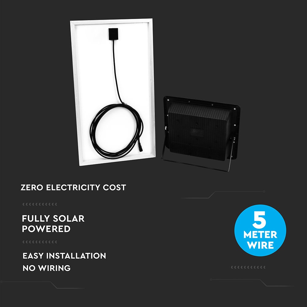 Flutlicht von V-TAC, Modell VT-200W, mit einer Lichtleistung von 3100 Lumen. Die Farbtemperatur beträgt 4000K, der Farbwiedergabeindex liegt über 70 und der Abstrahlwinkel beträgt 120°. Die Lebensdauer beträgt 20.000 Stunden und das Produkt ist mit der Schutzart IP65 für den Außenbereich geeignet. Die Abmessungen betragen 130 mm x 370 mm x 650 mm und das Gewicht liegt bei 6,514 kg. Das Flutlicht ist solarbetrieben und ermöglicht eine flexible Installation mit einem 5 Meter langen Kabel. Es verfügt über eine Fernbedienung, eine Auto- und Timerfunktion.