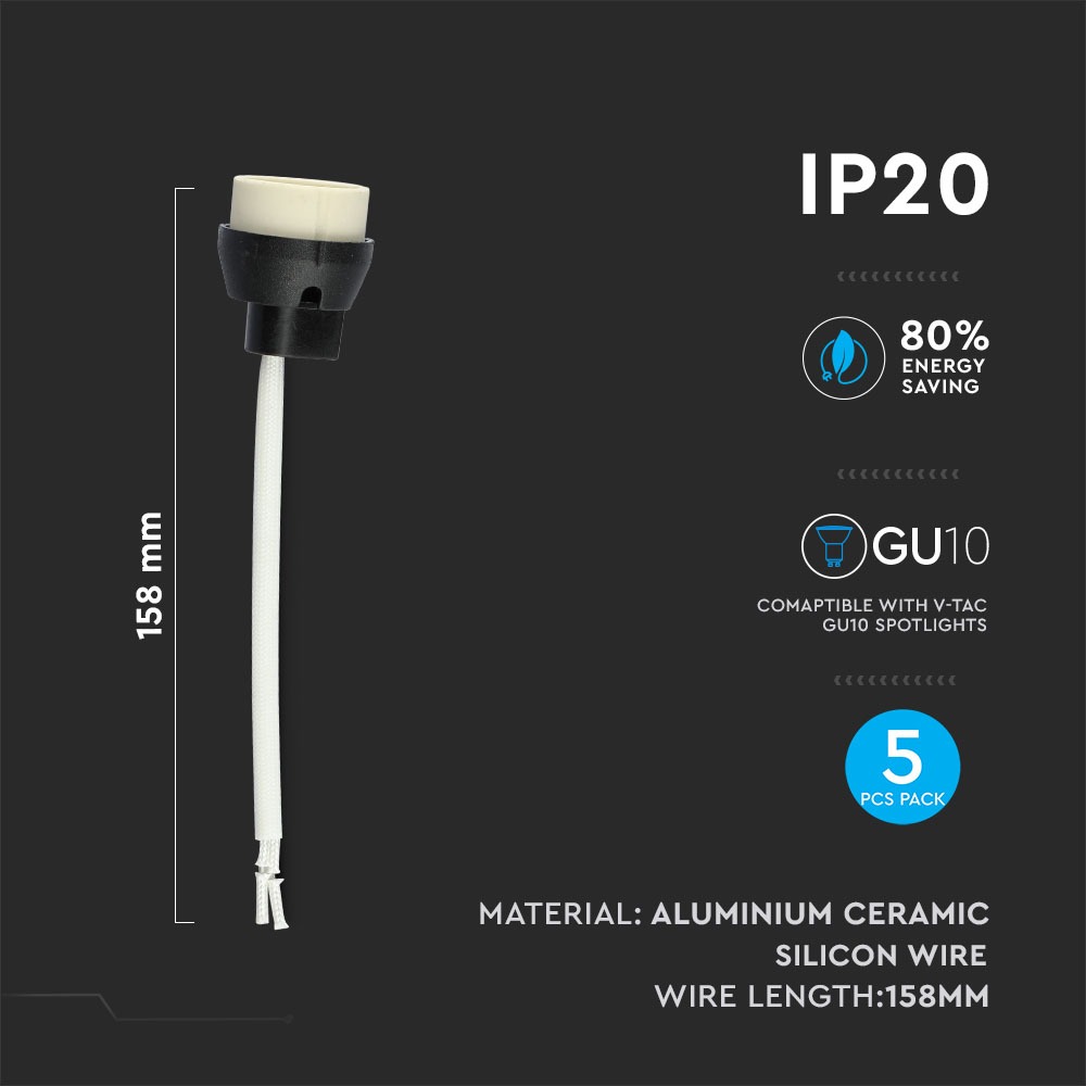GU10 Halter von V-TAC, Modell VT-791-5, geeignet für GU10 Leuchtmittel. Die Halter sind aus Aluminium und Keramik gefertigt und bieten eine einfache Installation. Die Drahtlänge beträgt 158 mm. Die Halter sind kompatibel mit GU10 Spots (Leuchtmittel nicht enthalten).