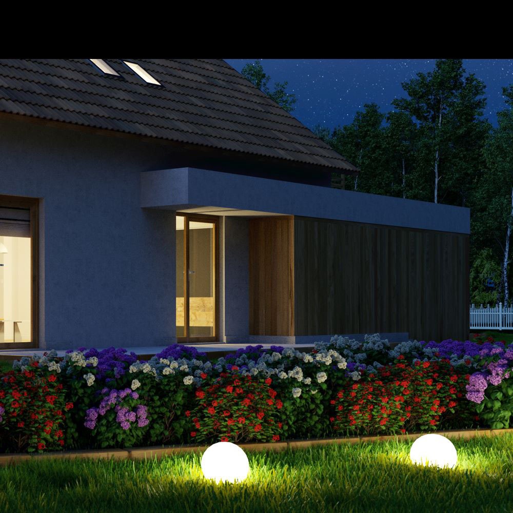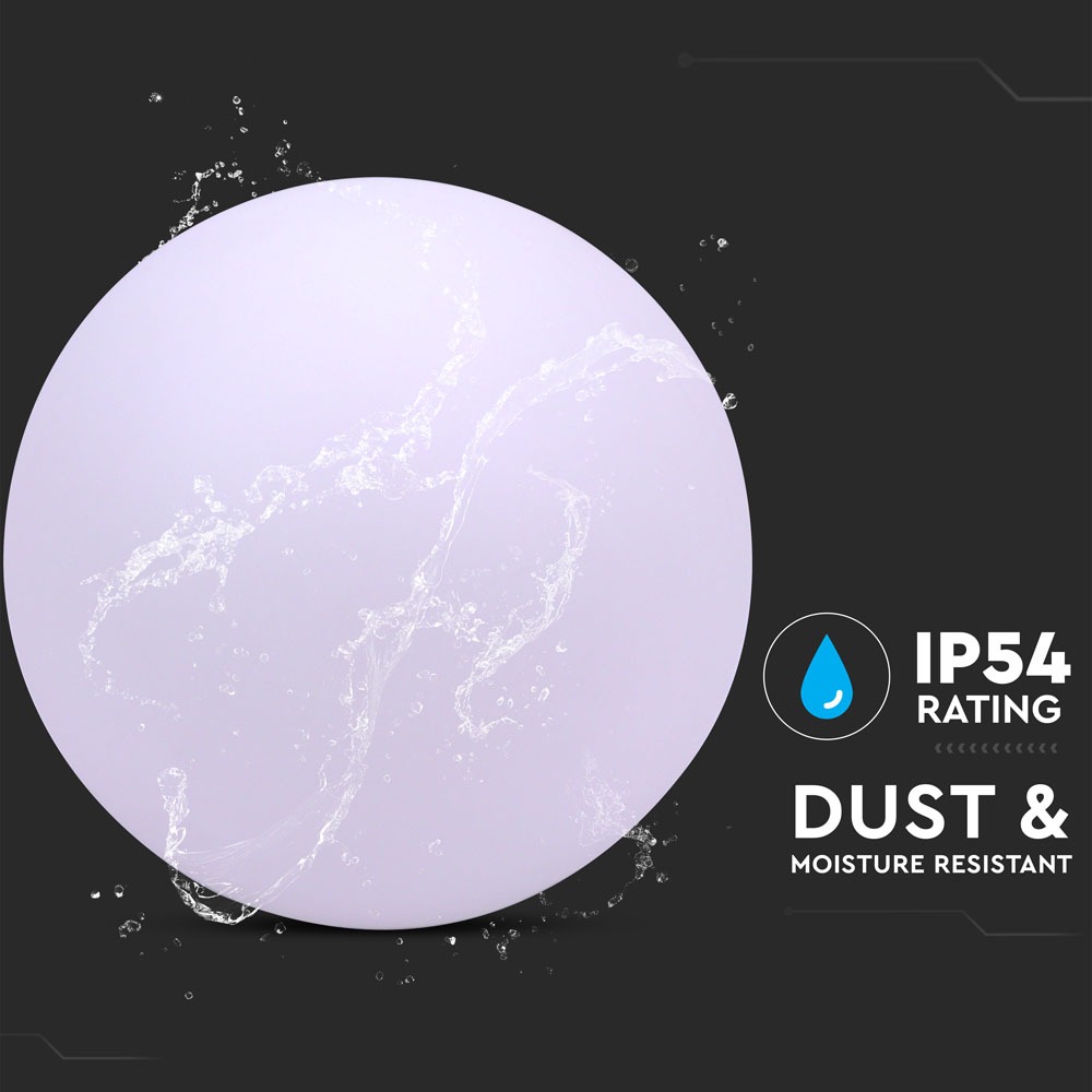 Gartenleuchte von V-TAC, Modell VT-7807, mit einer Leistung von 3W. Diese dekorative Beleuchtung bietet eine RGB-Farbpalette, ideal für die Gestaltung von Außenbereichen. Sie erzeugt 54 Lumen und ist mit einer IP54-Schutzart ausgestattet. Die Lebensdauer beträgt 50.000 Stunden, und die Leuchte wird mit einem Adapter geliefert. Die Maße betragen 420 mm x 410 mm x 410 mm, das Gewicht liegt bei 2,45 kg. Die Fernbedienung ermöglicht das Ein- und Ausschalten, Farbwechsel und Dimmen des Lichts.