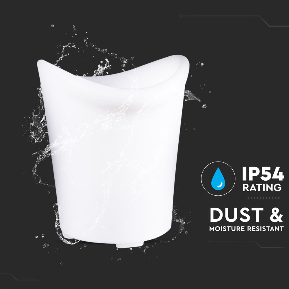 Gartenleuchte von V-TAC, Modell VT-7806, mit einer Leistung von 1,5W. Diese dekorative Beleuchtung bietet eine Lichtstärke von 54 Lumen und ist mit RGB-Farben ausgestattet, um die perfekte Atmosphäre zu schaffen. Die Lebensdauer beträgt 50.000 Stunden und die Leuchte ist mit einem wiederaufladbaren Lithium-Akku ausgestattet. Maße: 310mm x 350mm x 360mm, Gewicht 2,2kg. IP-Schutzart: IP54, geeignet für den Außenbereich.