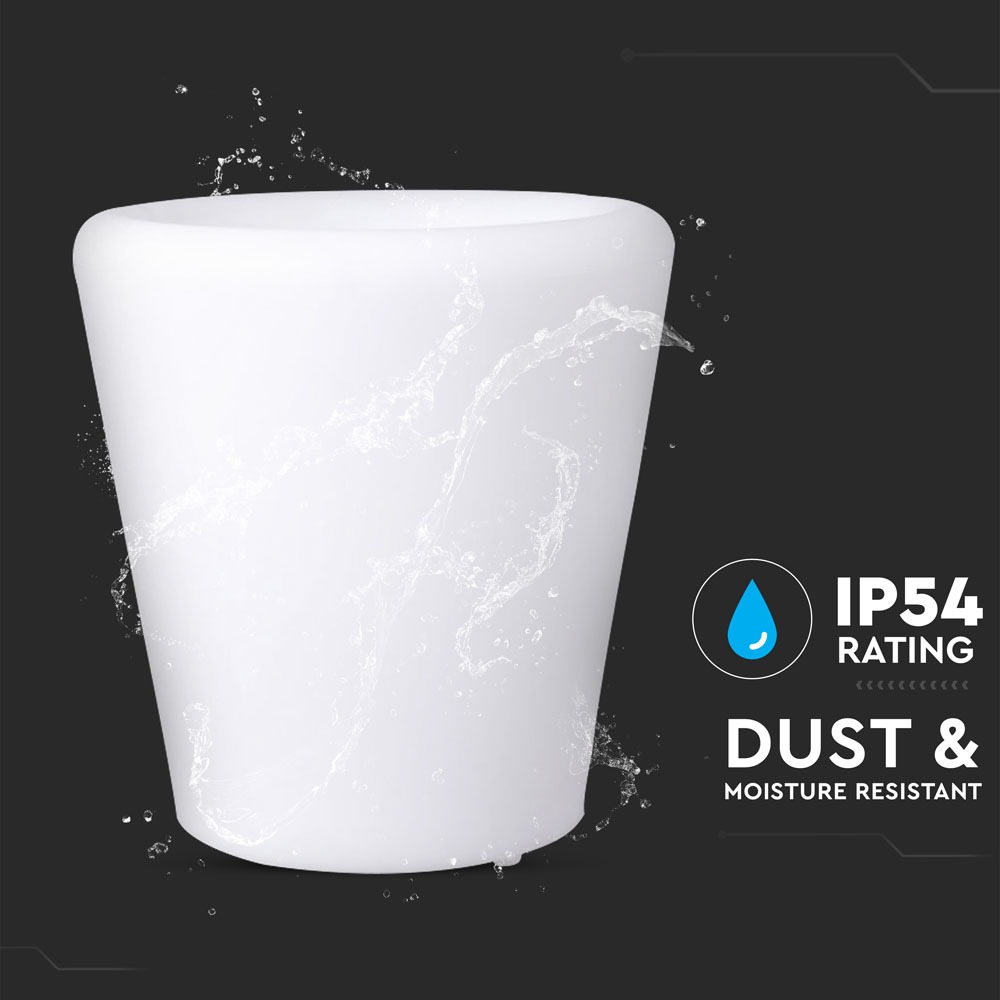 Gartenleuchte von V-TAC, Modell VT-7805, mit einer Leistung von 1W, geeignet für den Außenbereich. Sie bietet eine Lichtstärke von 18 Lumen und ist mit einer IP54 Schutzart ausgestattet. Die Lebensdauer beträgt 50.000 Stunden und die Leuchte ist mit einem wiederaufladbaren Lithium-Akku ausgestattet. Die Maße betragen 290mm x 290mm x 300mm und das Gewicht liegt bei 1,47kg. Die moderne dekorative Beleuchtung ermöglicht die Steuerung per Fernbedienung, um die Farben zu wechseln oder die Helligkeit zu dimmen.