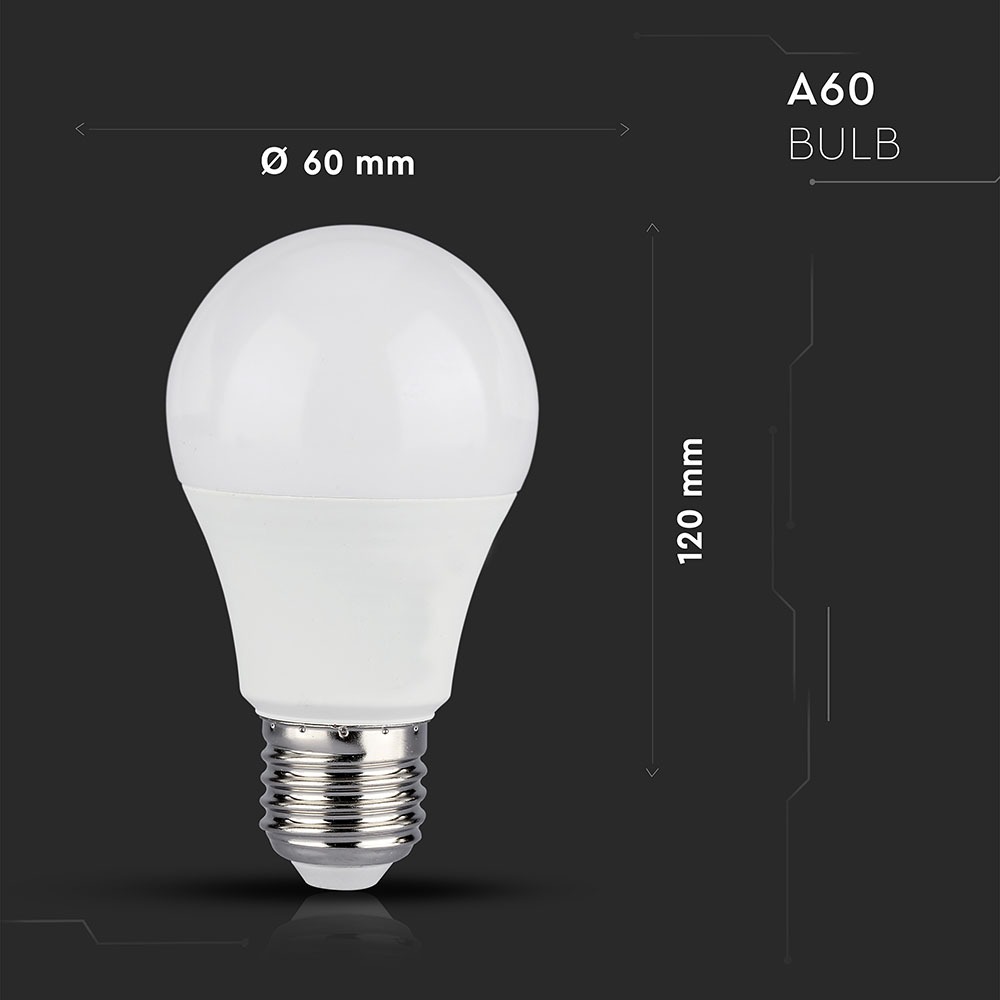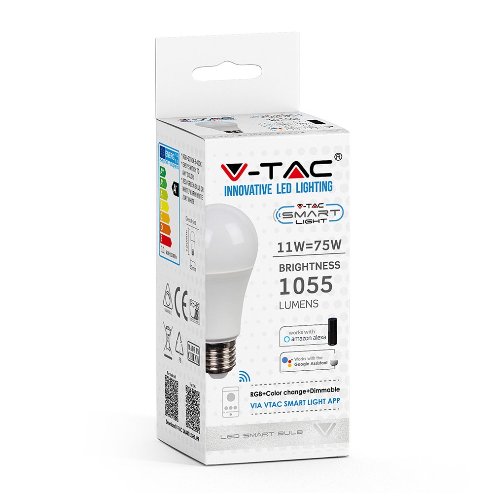 Glühbirne von V-TAC, Modell VT-5113, mit einer Leistung von 11 Watt, geeignet für den Einsatz in Wohnräumen, Büros und Hotels. Sie bietet eine Lichtleistung von 1055 Lumen, einen hohen Farbwiedergabeindex von über 80 und einen Abstrahlwinkel von 200°. Die Lebensdauer beträgt bis zu 30.000 Stunden und die Lampe ist mit einer Garantie von 2 Jahren ausgestattet. Die Maße betragen 65 mm x 65 mm x 120 mm und das Gewicht liegt bei 0,116 kg. Die Installation ist einfach und kann über die V-TAC Smart Life App erfolgen. Funktionen: WLAN-fähig, Farbwechsel, Dimmfunktion.
