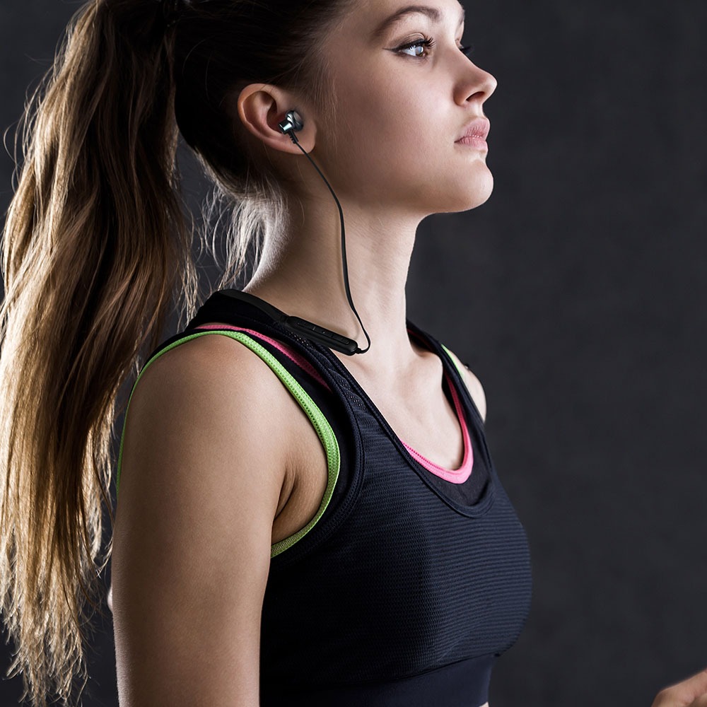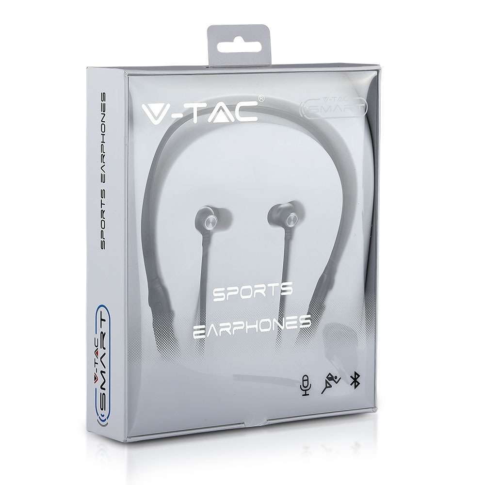 In-Ear Kopfhörer von V-TAC, Modell VT-6166-B. Diese Sportkopfhörer bieten einen klaren Klang und sind für den aktiven Einsatz konzipiert. Sie verfügen über ein komfortables In-Ear-Design und sind mit Bluetooth-Technologie kompatibel. Die Kopfhörer sind mit magnetischen Ohrstöpseln und einem integrierten Mikrofon für freihändiges Telefonieren ausgestattet. Maße: 170mm x 40mm x 200mm, Gewicht: 0,185 kg.