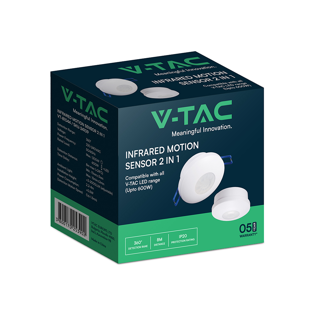 Der Infrarotsensor von V-TAC, Modell VT-81044, eignet sich ideal für den Einsatz in Innenräumen. Er verfügt über eine Schutzart von IP20 und kann sowohl eingelassen als auch oberflächenmontiert werden. Der Sensor erkennt Wärmesignaturen und bietet eine einstellbare Zeitverzögerung sowie Anpassungsmöglichkeiten für Umgebungslicht und Erfassungsdistanz. Mit hochwertigen Rezeptoren sorgt er für eine sofortige Funktion und trägt zur Energieeinsparung und Sicherheit bei. Die Abmessungen betragen 102,0 mm x 60,0 mm x 93,0 mm bei einem Gewicht von 0,12 kg. Der Sensor ist mit allen V-TAC LED-Produkten bis zu 600W kompatibel.