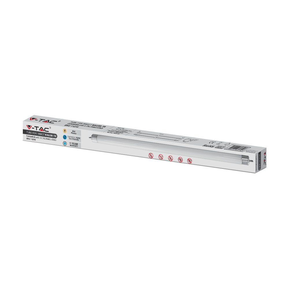 Insektenvernichter von V-TAC, Modell 11215, mit einer Leistung von 8 Watt. Diese Röhre ist für den Einsatz in Insektenvernichtern konzipiert. Die Lebensdauer beträgt bis zu 8000 Stunden. Die Röhre ist chemiefrei und umweltfreundlich. Sie ist kompatibel mit dem V-TAC Insektenvernichter VT-3216.
