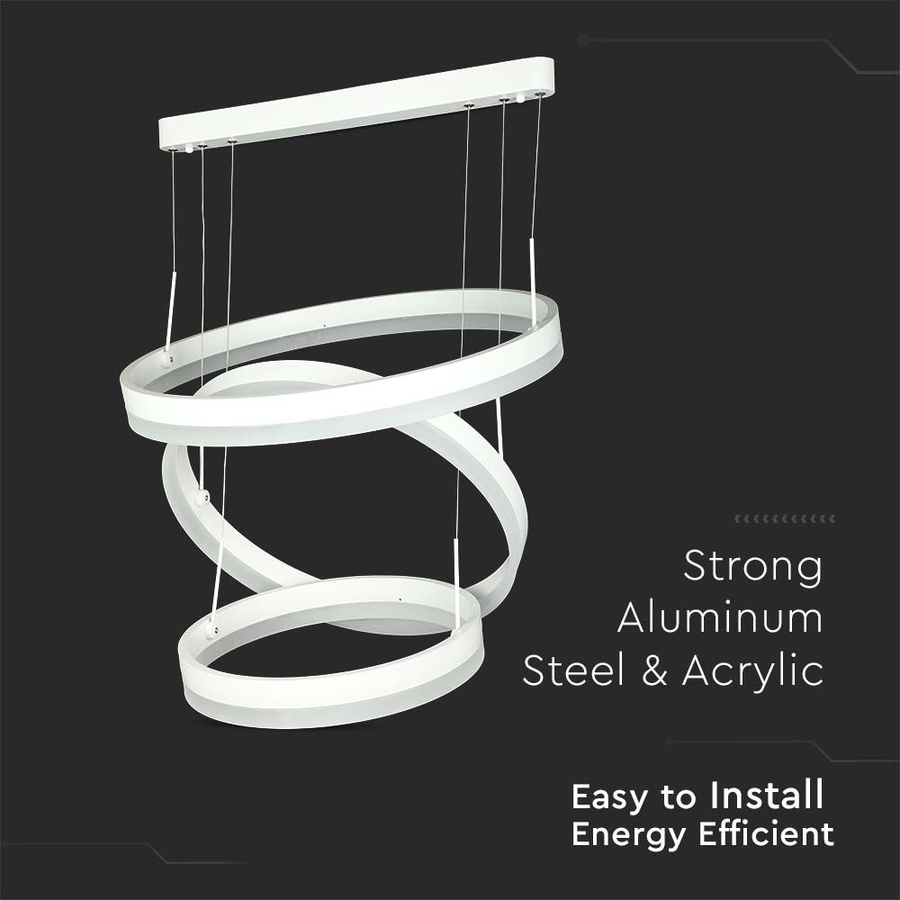 Kronleuchter von V-TAC, Modell VT-82-3-W-N, mit einer Leistung von 86W, geeignet für verschiedene Anwendungen. Der Kronleuchter bietet eine Lichtleistung von 4550 Lumen und einen Abstrahlwinkel von 360°. Die Lebensdauer beträgt 3 Jahre. Maße: 730mm x 655mm x 120mm, Gewicht 5,2 kg. Integrierte LEDs und eine Dimmfunktion ermöglichen die Anpassung der Lichtintensität.