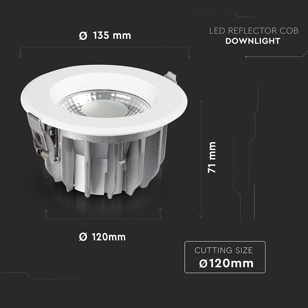 LED Downlight von V-TAC, Modell VT-26101 mit 10 Watt Leistung, ideal für den Einsatz in Wohnräumen, Ausstellungsräumen, Hotels und Boutiquen. Das Produkt bietet eine Lichtstärke von 1200 Lumen bei einer Effizienz von 120 lm/W und einer Farbtemperatur von 6400K. Die Lebensdauer beträgt bis zu 20.000 Stunden und erfüllt hohe Qualitätsstandards. Die Maße betragen 140 mm x 110 mm x 140 mm, das Gewicht liegt bei 0,53 kg. Ausgestattet mit einem hochwertigen COB LED-Chip und einem Aluminiumgehäuse für optimale Wärmeableitung.