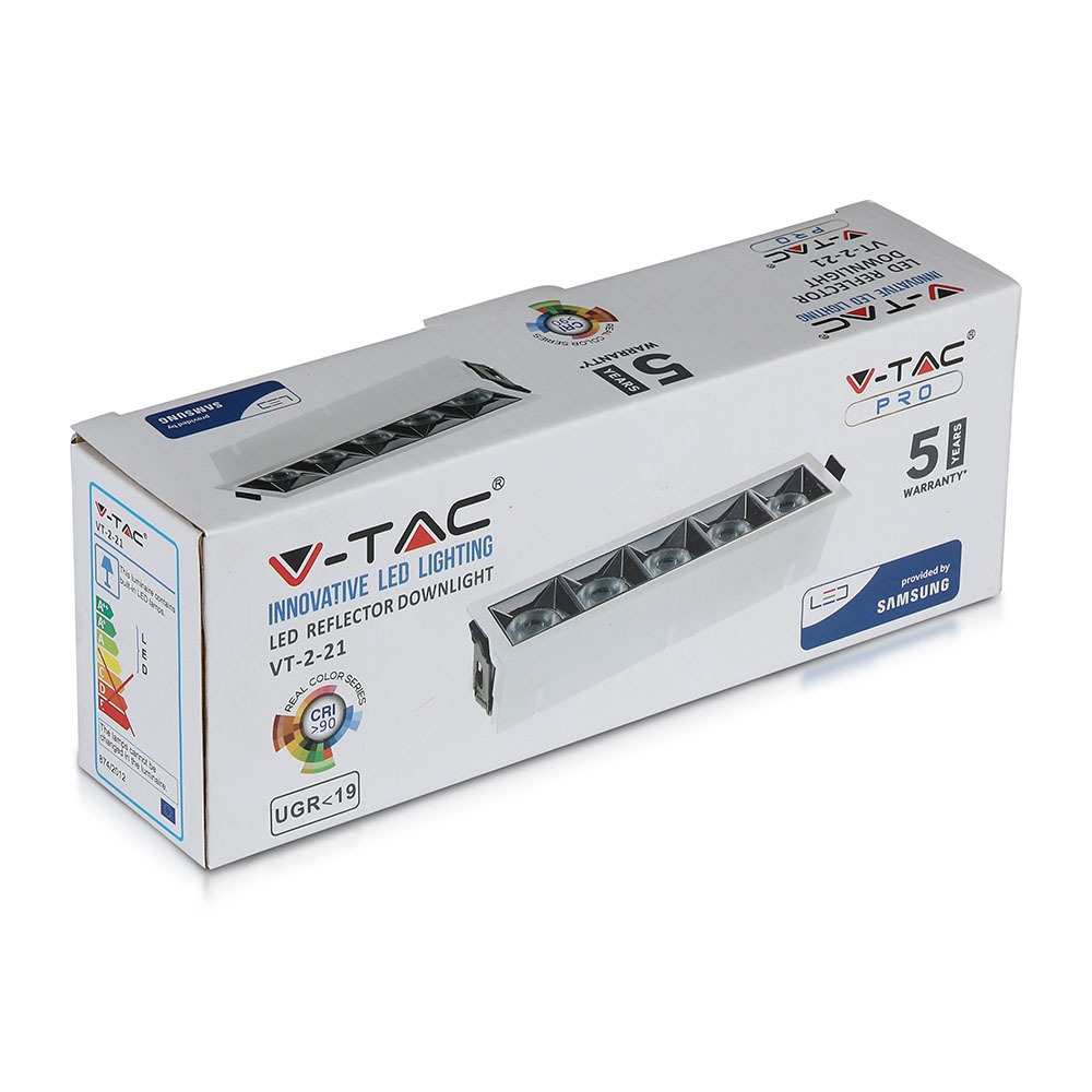 LED Downlight von V-TAC, Modell VT-2-21, mit einer Leistung von 20 Watt, geeignet für den Einbau in Decken. Das Produkt bietet eine Lichtausbeute von 1600 Lumen, einen Farbwiedergabeindex von über 90 und einen Abstrahlwinkel von 12°. Die Lebensdauer beträgt 30.000 Stunden und es wird eine Garantie von 5 Jahren gewährt. Die Abmessungen sind 55 mm in der Höhe, 220 mm in der Breite und 80 mm in der Tiefe, mit einem Gewicht von 0,589 kg. Das Produkt ist mit einem schnellen Anschluss für eine einfache Verdrahtung ausgestattet und eignet sich für Hotels, Showrooms, Einzelhandelsgeschäfte und Boutiquen.