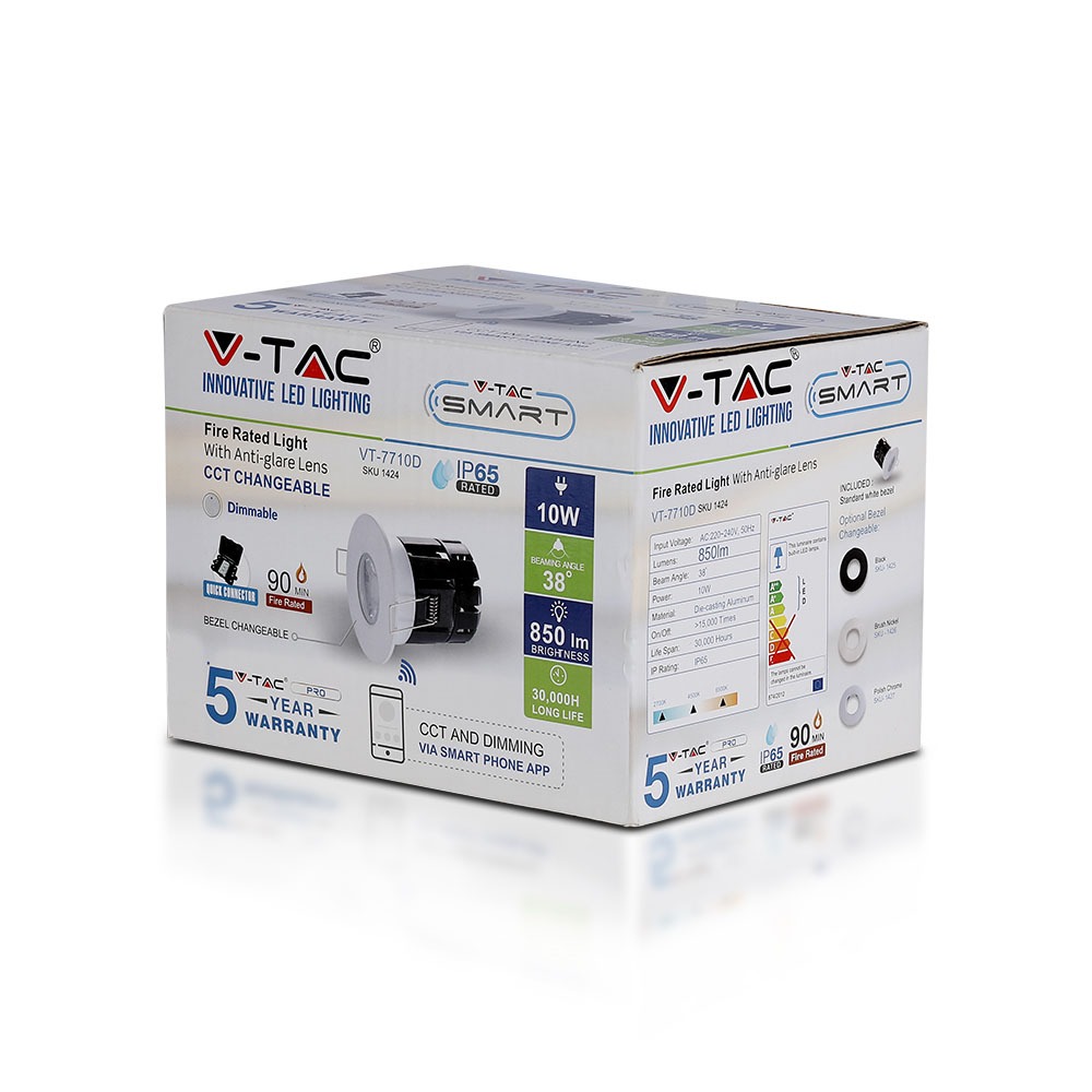 LED Einbauleuchte von V-TAC, Modell VT-7710, mit einer Leistung von 10 Watt, geeignet für den Innen- und Außenbereich. Sie bietet eine Lichtstärke von 850 Lumen und einen Abstrahlwinkel von 38°. Die Lebensdauer beträgt 30.000 Stunden und die Leuchte ist mit einer IP65 Schutzart ausgestattet. Die Montage erfolgt als Einbauleuchte. Die Leuchte ist farbwechselbar und dimmbar über eine Smartphone-App. Zudem ist sie feuerbeständig bis zu 90 Minuten und bietet effektiven Schallschutz sowie Luftdichtheit.