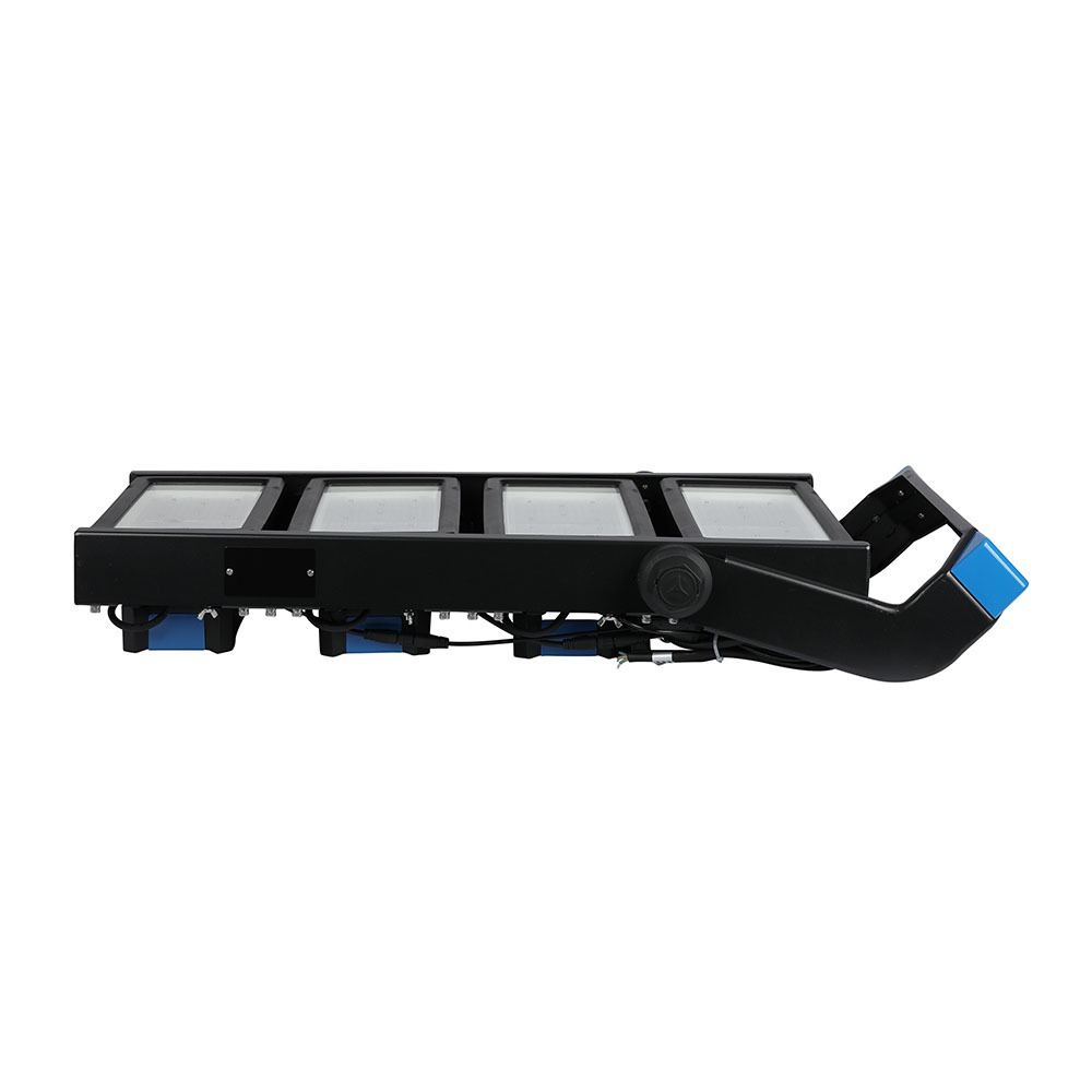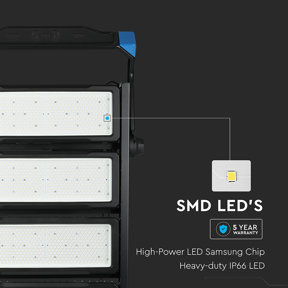 LED Flutlicht von V-TAC, Modell VT-1002D, mit einer Leistung von 1000W, geeignet für den Außenbereich. Es bietet eine Lichtstärke von 120000 Lumen bei einem Wirkungsgrad von 120 lm/W und einer Farbtemperatur von 4000K. Die Lebensdauer beträgt bis zu 50.000 Stunden und der Treiber ist von Meanwell. Maße: 230mm x 630mm x 1020mm, Gewicht 35kg. IP66 Schutzklasse sorgt für hohe Widerstandsfähigkeit gegen Staub und Feuchtigkeit.