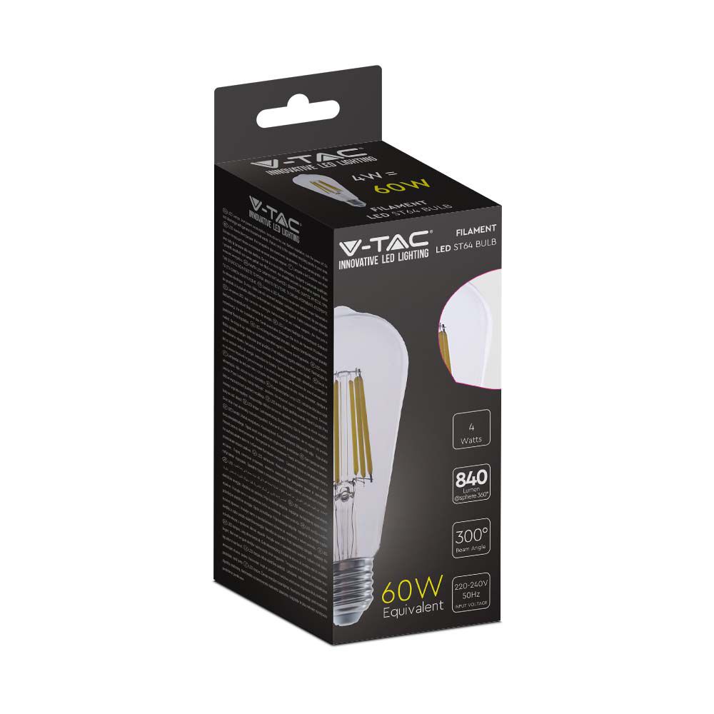 LED Glühbirne von V-TAC, Modell VT-2364, mit einer Leistung von 4W, geeignet für Wohnräume und dekorative Beleuchtung. Sie bietet eine Lichtausbeute von 840 Lumen bei 210 lm/W, mit einer Farbtemperatur von 3000K und einem Abstrahlwinkel von 300°. Die Lebensdauer beträgt 20.000 Stunden, was eine längere Lebensdauer als herkömmliche Halogenlampen gewährleistet. Die Maße betragen 66mm x 66mm x 150mm und das Gewicht liegt bei 0,07kg. Diese Glühbirne ersetzt eine 60W Halogenlampe und hat einen hohen Farbwiedergabeindex von CRI >80.