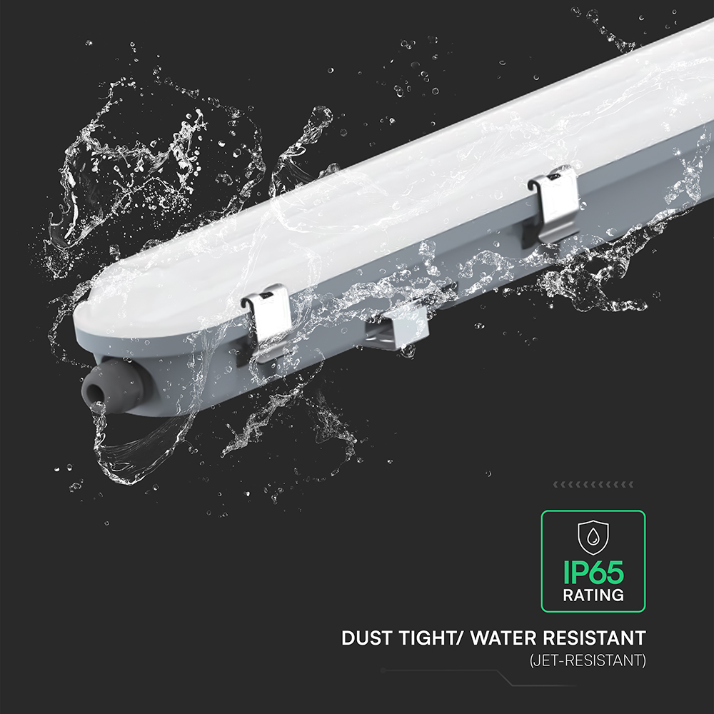Die LED-Leuchte von V-TAC, Modell VT-150149E, mit einer Leistung von 48 Watt eignet sich ideal für den Einsatz in Parkplätzen, Lagerhäusern und Werkstätten. Sie bietet eine Lichtleistung von 5760 Lumen bei einer Effizienz von 120 lm/W, einer Farbtemperatur von 6500K und einem Farbwiedergabeindex von über 80. Der Abstrahlwinkel beträgt 120 Grad und die Schutzart ist IP65. Die Lebensdauer beträgt 20.000 Stunden, was auf die Verwendung von Hochleistungs-SMD-Technologie zurückzuführen ist. Die Abmessungen der Verpackung sind 1260 mm x 85 mm x 75 mm bei einem Gewicht von 2,43 kg. Die Leuchte verfügt über eine Notstromversorgung für bis zu 3 Stunden und ist aus einem robusten PC+PC-Gehäuse mit Edelstahlklammern gefertigt.