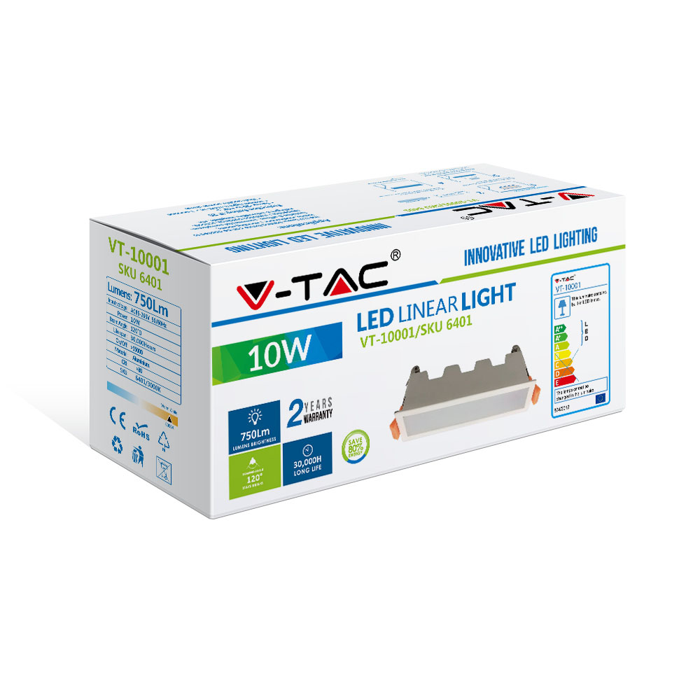 LED Mini Panel von V-TAC, Modell VT-10001, mit einer Leistung von 10 Watt, geeignet für den Einbau. Es bietet eine Lichtausbeute von 750 Lumen, einen Farbwiedergabeindex von über 80 und einen Abstrahlwinkel von 120°. Die Lebensdauer beträgt 30.000 Stunden und es ist mit einem nicht dimmbaren Treiber ausgestattet. Die Maße betragen 60 mm in der Länge, 175 mm in der Breite und 80 mm in der Höhe, mit einem Gewicht von 0,317 kg. Es eignet sich für Büros, Konferenzräume, Showrooms und Küchen.