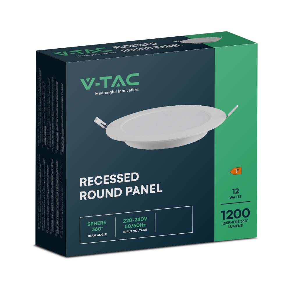 LED Mini Panel von V-TAC, Modell VT-61012-RD, mit einer Leistung von 12 Watt, geeignet für Büros, Konferenzräume, Showrooms und Küchen. Das Panel bietet eine Lichtausbeute von 1200 Lumen und hat einen Farbwiedergabeindex von über 80. Die Lebensdauer beträgt 20.000 Stunden, was für eine hohe Qualität spricht. Die Maße betragen 175 mm x 175 mm x 40 mm und das Gewicht liegt bei 0,17 kg. Umweltfreundlich, da ohne Blei oder Quecksilber.
