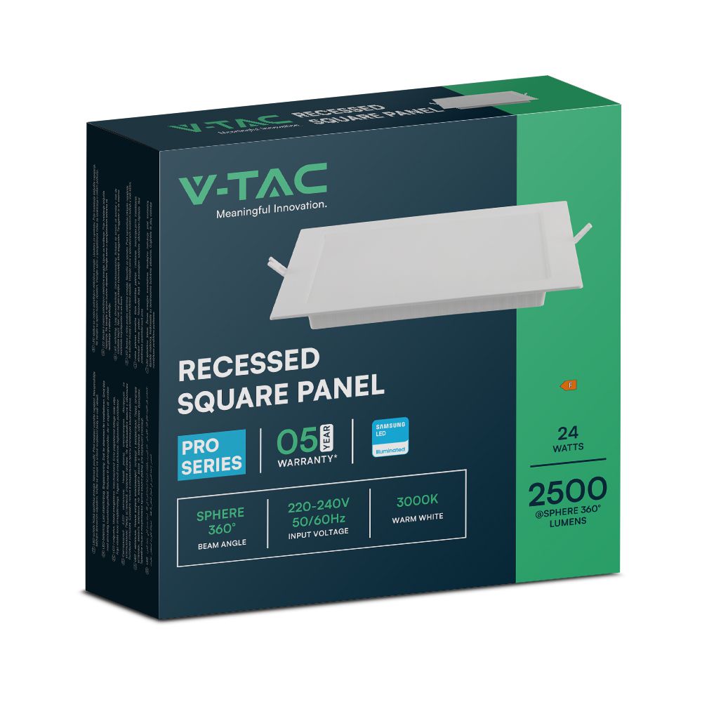 LED Mini Panel von V-TAC, Modell VT-61024SQ-S, mit einer Leistung von 24 Watt, geeignet für den Einbau in Decken. Es bietet eine Lichtleistung von 2500 Lumen mit einem Farbwiedergabeindex von über 80 und einer Farbtemperatur von 3000K. Die Lebensdauer beträgt 20.000 Stunden, was durch einen hochwertigen Treiber unterstützt wird. Die Abmessungen betragen 303 mm x 35 mm x 294 mm und das Gewicht liegt bei 0,49 kg. Umweltfreundlich, da es keinen Blei- oder Quecksilbergehalt aufweist und für Büros, Konferenzräume und Küchen geeignet ist.