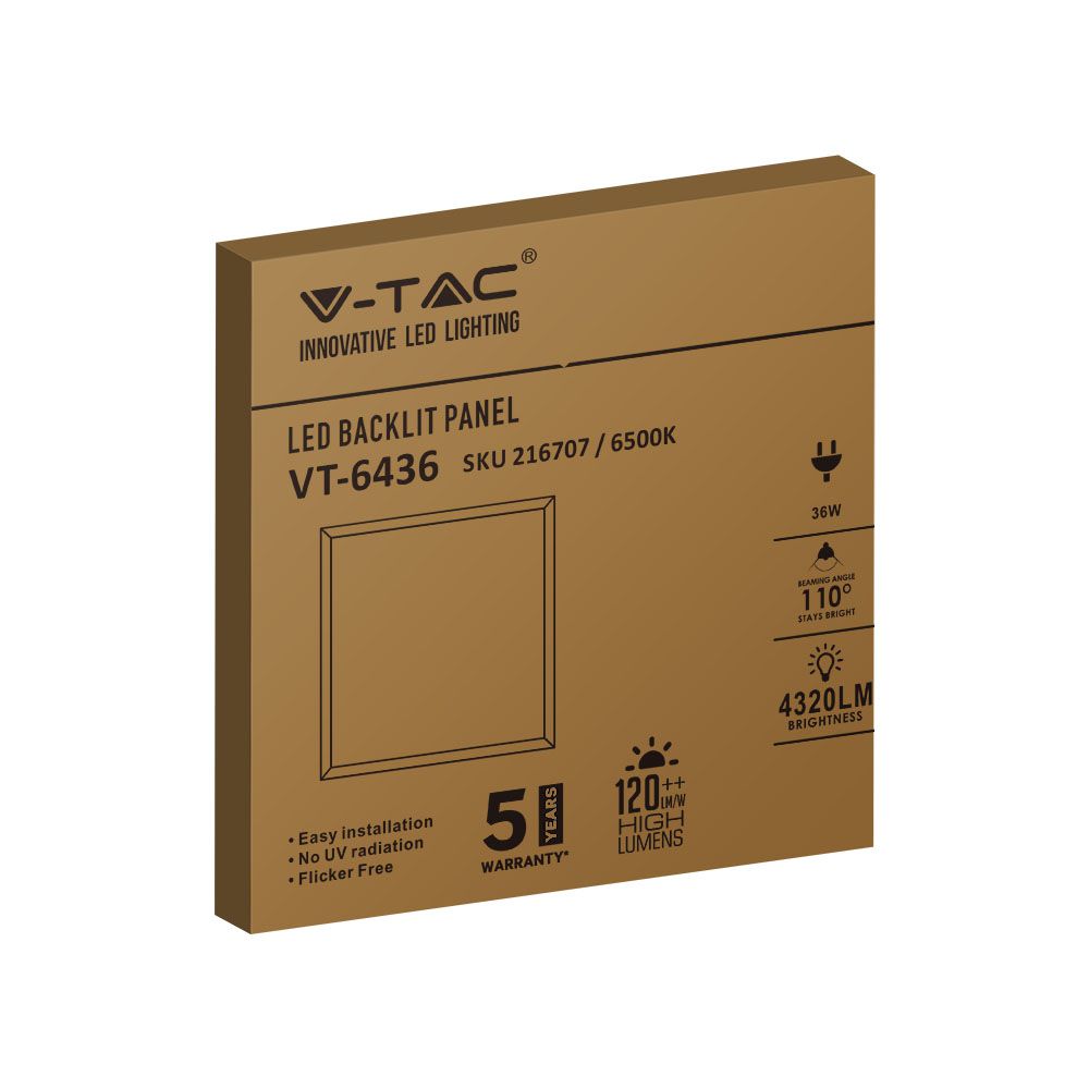 LED Panel von V-TAC, Modell VT-6436-N, mit einer Leistung von 36 Watt, geeignet für Büros, Konferenzräume, Ausstellungsräume, Lobbys, Kabinen und Küchen. Das Panel bietet eine Lichtausbeute von 4320 Lumen bei 120 lm/W, einer Farbtemperatur von 6400K und einem Farbwiedergabeindex von über 80. Die Lebensdauer beträgt bis zu 30.000 Stunden und es ist mit einem integrierten Treiber ausgestattet. Die Abmessungen betragen 630 mm x 620 mm x 340 mm und das Gewicht liegt bei 1,63 kg. Hochwertige Materialien sorgen für eine robuste Bauweise.