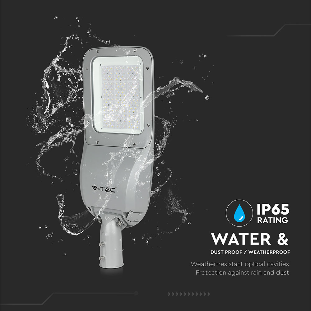 LED Strassenleuchte von V-TAC, Modell VT-120ST, mit einer Leistung von 120 Watt, geeignet für Straßenbeleuchtung. Die Leuchte bietet eine Lichtausbeute von 15600 Lumen bei 130 lm/W und hat eine Farbtemperatur von 4000K sowie einen Abstrahlwinkel von 150x80°. Die Lebensdauer beträgt bis zu 30.000 Stunden und die Leuchte ist mit einem Treiber ausgestattet, der 0-10V dimmbar ist. Die Abmessungen betragen 600mm x 290mm x 110mm und das Gewicht liegt bei 8,503 kg. Die Leuchte verfügt über einen Überspannungsschutz von 10KV und eine IK-Schutzart von IK08.