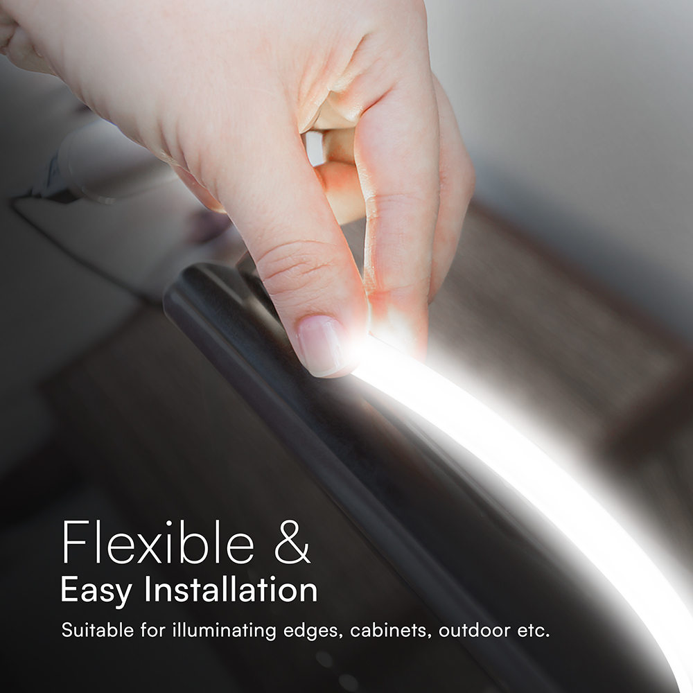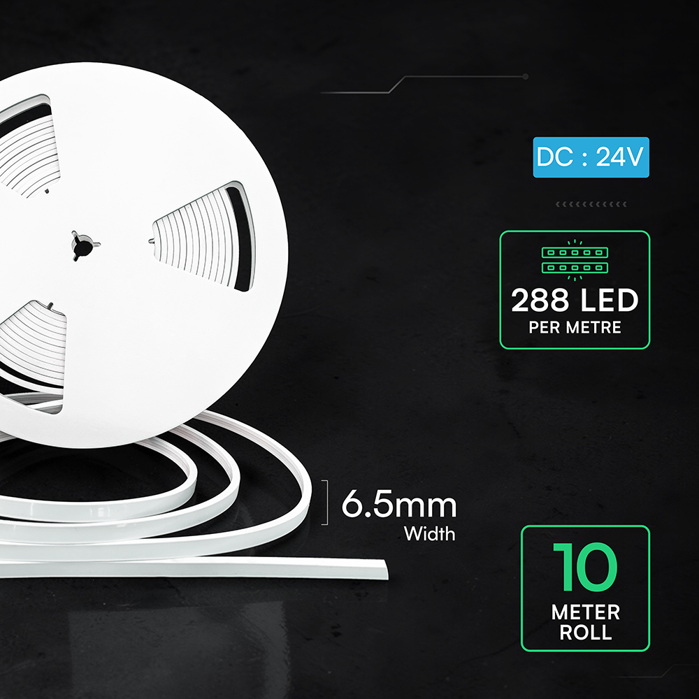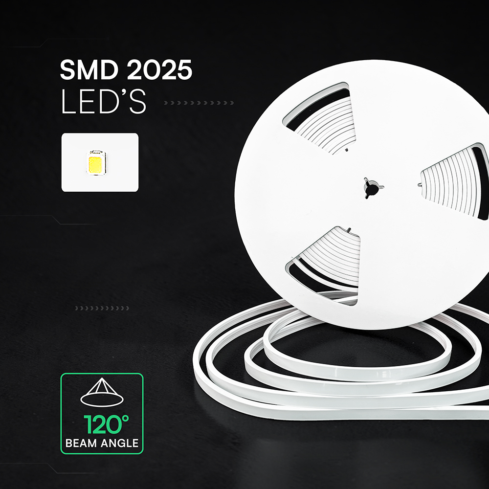 Der LED-Streifen Neon Flex von V-TAC, Modell VT-564, eignet sich ideal für Anwendungen im Innen- und Außenbereich. Mit einer Farbtemperatur von 6500K bietet er eine gleichmäßige Ausleuchtung über die gesamte Länge. Der Farbwiedergabeindex liegt bei über 80, und der Abstrahlwinkel beträgt 120 Grad. Der Streifen ist IP65-zertifiziert, was ihn wetterfest und für den Außeneinsatz geeignet macht. Das Gewicht beträgt 0,07 kg, und die Installation ist dank der hohen Flexibilität des Materials einfach. Der Streifen wird in einer 10-Meter-Rolle geliefert und kann mit einem sicheren Niederspannungs-24V-DC-Adapter betrieben werden.
