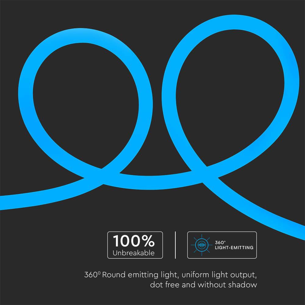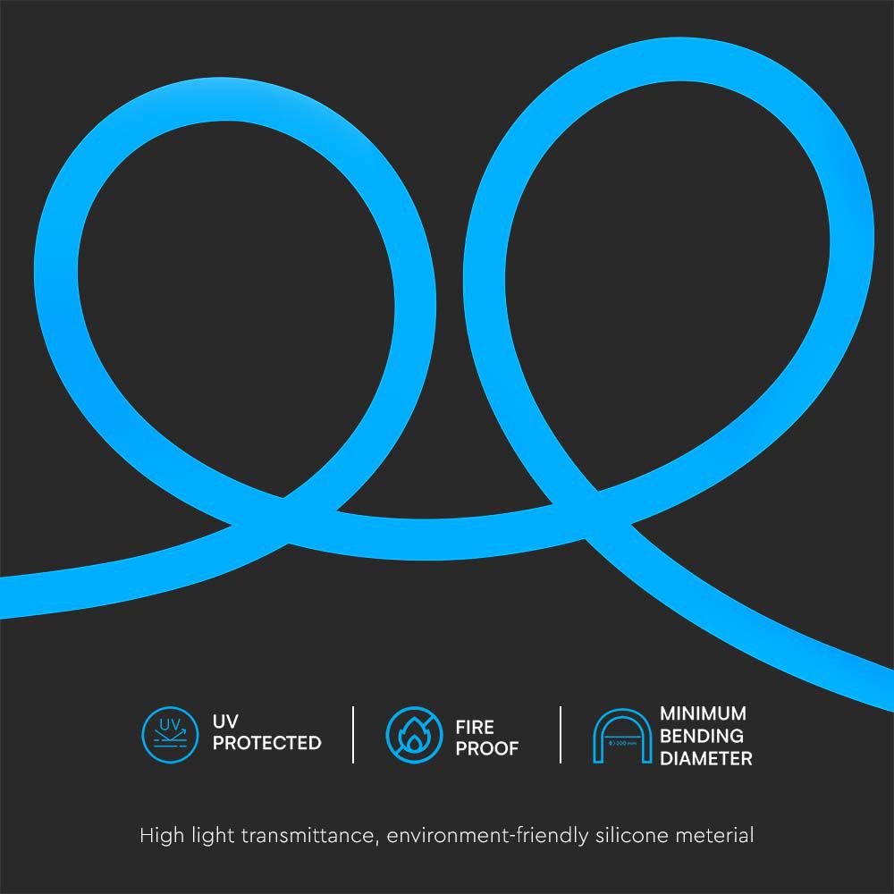 LED Streifenleuchte von V-TAC, Modell VT-551, ideal für dekorative Beleuchtung. Diese Neon Flex Leuchte bietet eine gleichmäßige Lichtverteilung mit einem Abstrahlwinkel von 360°. Sie ist aus umweltfreundlichem Silikonmaterial gefertigt und hat eine IP20 Schutzart. Mit einem Gewicht von 0,57 kg ist sie flexibel und einfach zu installieren. Die Leuchte eignet sich hervorragend zur Beleuchtung von Kanten, Regalen und Außenbereichen.