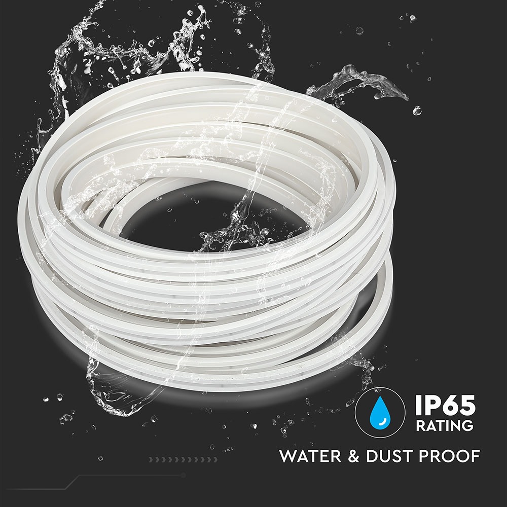 LED Streifenleuchte von V-TAC, Modell VT-559, mit einer Farbtemperatur von 6400K. Diese Neon Flex Leuchte bietet eine gleichmäßige Ausleuchtung entlang der gesamten Länge. Sie ist flexibel installierbar und kann alle 1 Meter geschnitten und wieder verbunden werden. Mit einer Lebensdauer von 20.000 Stunden und einer IP65 Wetterbeständigkeit eignet sie sich sowohl für Innen- als auch für Außenanwendungen. Die Leuchte arbeitet mit einer sicheren Niederspannung von 24V DC und hat eine PCB-Breite von 8mm.