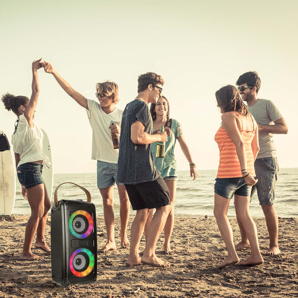 Lautsprecher von V-TAC, Modell VT-6203-2, mit einer Leistung von 20W. Dieser tragbare Lautsprecher eignet sich ideal für Veranstaltungen und Partys. Er bietet eine Vielzahl von Funktionen, darunter eine Wiedergabezeit von bis zu 6 Stunden und Unterstützung für drahtlose Verbindungen sowie USB- und TF-Karten. Die Abmessungen betragen 185 mm x 160 mm x 370 mm, das Gewicht liegt bei 1,83 kg. Der Lautsprecher ist mit aufregenden Partylichtern ausgestattet und verfügt über ein FM-Radio mit einer Frequenz von 87,5-108 MHz.