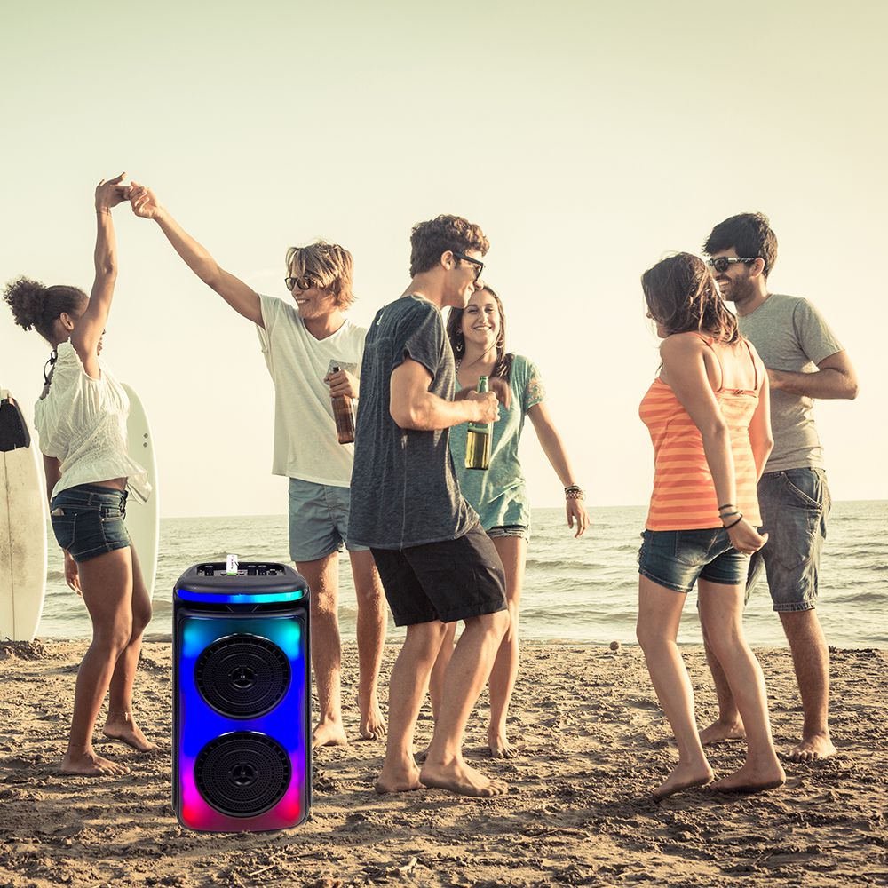 Lautsprecher von V-TAC, Modell VT-4000W, mit einer Leistung von 400W. Dieser tragbare Lautsprecher ist ideal für Veranstaltungen und Partys. Er verfügt über einen Dual 6,5 Zoll Woofer mit einer Ausgangsleistung von 20W. Die Maße betragen 270mm x 255mm x 540mm und das Gewicht liegt bei 3,4 kg. Der Lautsprecher bietet verschiedene Steuerungsmöglichkeiten wie kabellos, USB, FM-Radio und Fernbedienung. Ein kabelgebundenes Mikrofon sowie LED-Lichter sind im Lieferumfang enthalten.