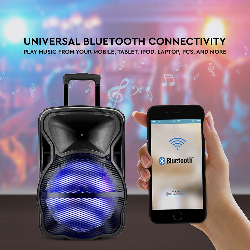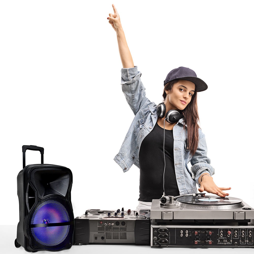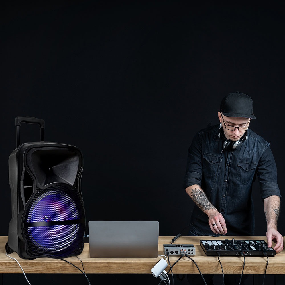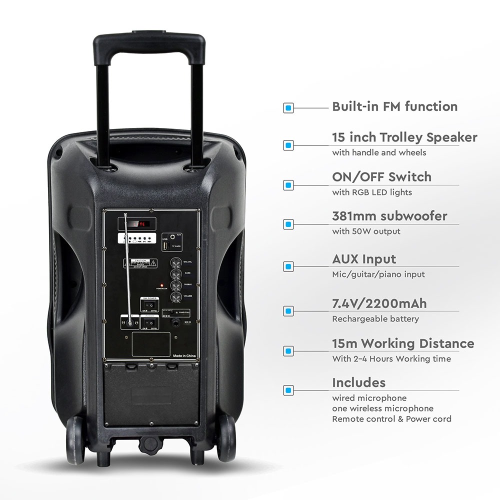 Lautsprecher von V-TAC, Modell VT-6315, mit einer Leistung von 50W, geeignet für verschiedene Veranstaltungen. Der Lautsprecher verfügt über RGB-LED-Lichter und bietet eine drahtlose Steuerung sowie USB- und Micro-SD-Anschlüsse. Er ist mit einem 15-Zoll-Woofer ausgestattet, der eine Ausgangsleistung von 35W liefert. Die Maße betragen 400mm x 440mm x 660mm und das Gewicht liegt bei 10,6 kg. Ideal für Partys, Karaoke und Meetings.