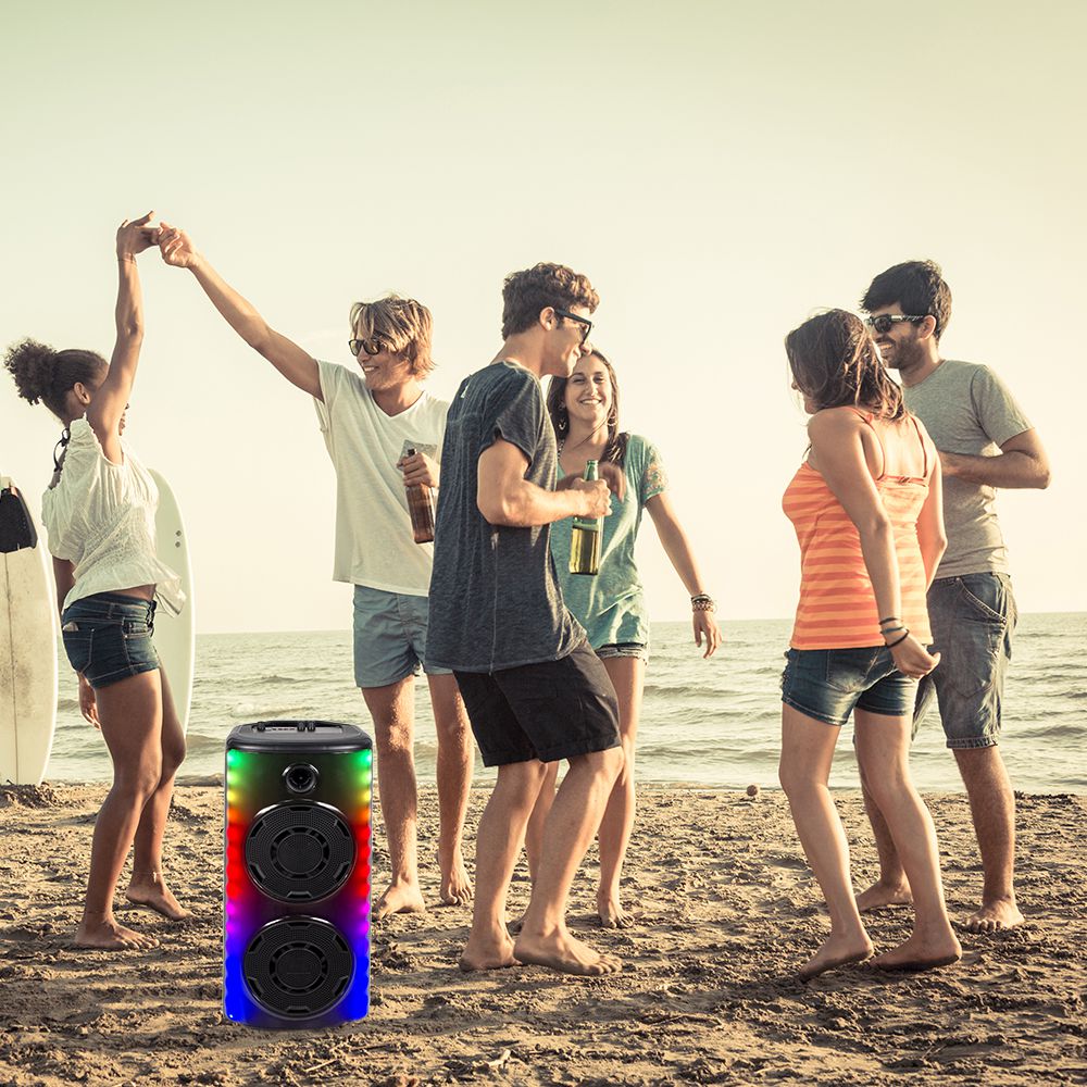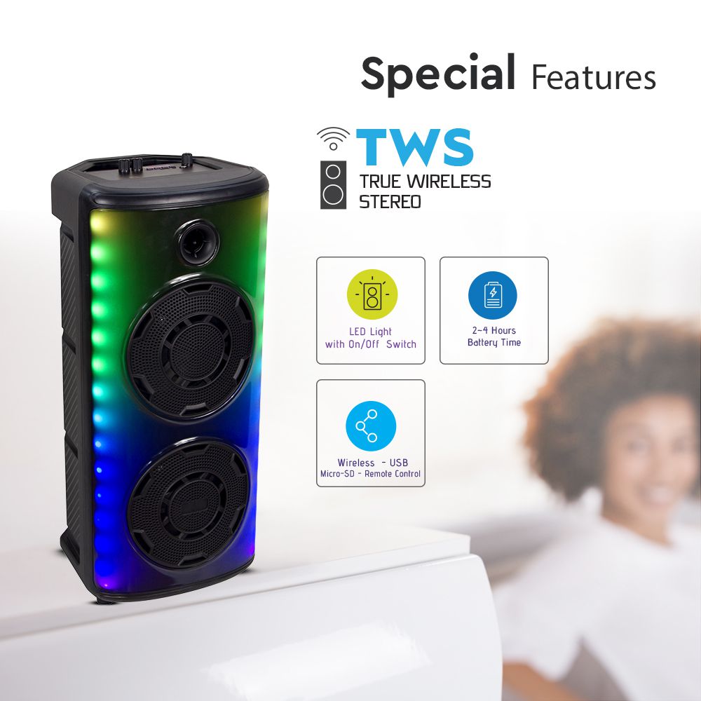Lautsprecher von V-TAC, Modell VT-6000W, mit einer Leistung von 600W. Dieser tragbare Lautsprecher ist mit einem Dual 8 Zoll Woofer ausgestattet und eignet sich ideal für Veranstaltungen und Partys. Er bietet eine Ausgangsleistung von 30W und unterstützt die TWS-Funktion für kabelloses Musikhören. Die Maße betragen 320mm x 295mm x 640mm bei einem Gewicht von 5,2 kg. Der Lautsprecher verfügt über verschiedene Steuerungsmöglichkeiten wie kabellose Steuerung, USB, FM-Radio und Fernbedienung.