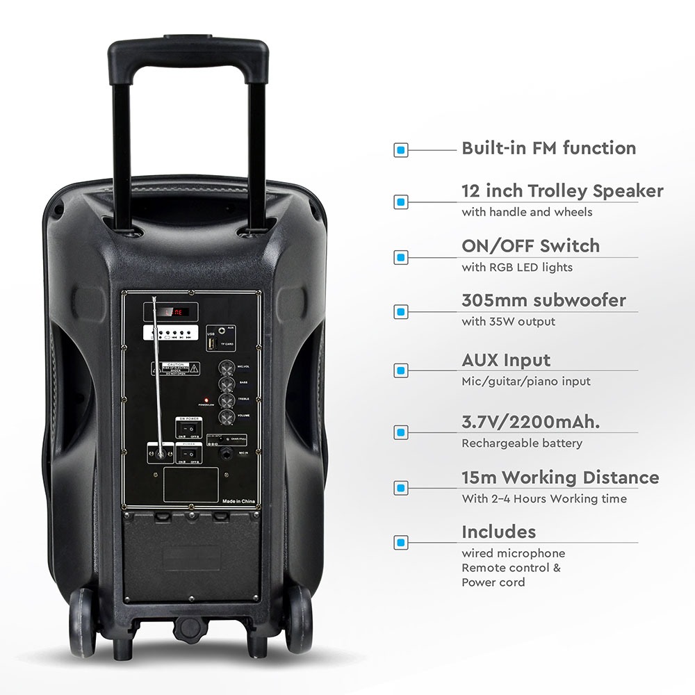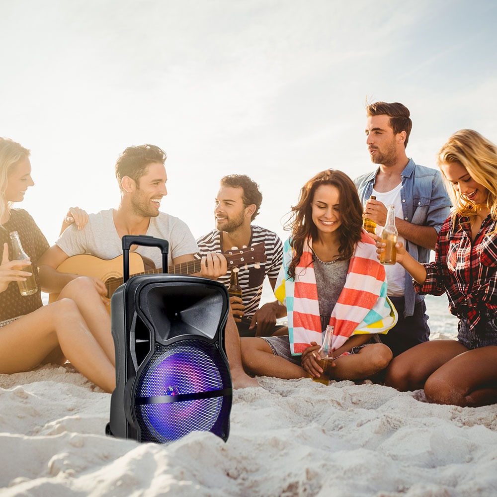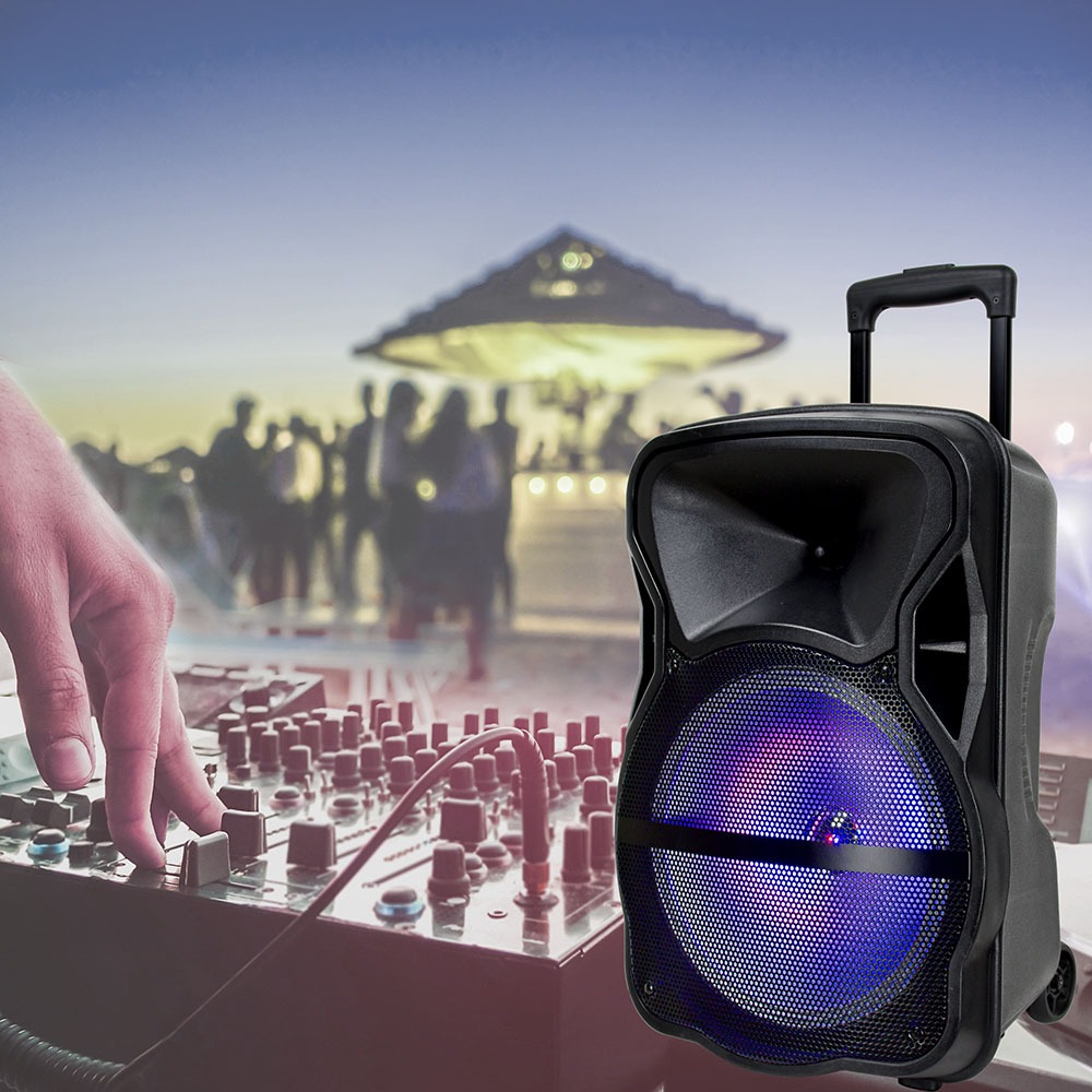Lautsprecher Trolley von V-TAC, Modell VT-6312, mit einer Leistung von 35W. Ausgestattet mit einem 12-Zoll-Woofer für kraftvollen Klang. Die RGB-LED-Leuchten sorgen für eine ansprechende Lichtatmosphäre. Das Gerät verfügt über eine Reichweite von bis zu 15 m über Bluetooth und ist ideal für Partys, Karaoke und Meetings geeignet. Mit praktischen Griffen und Rollen für einfachen Transport.