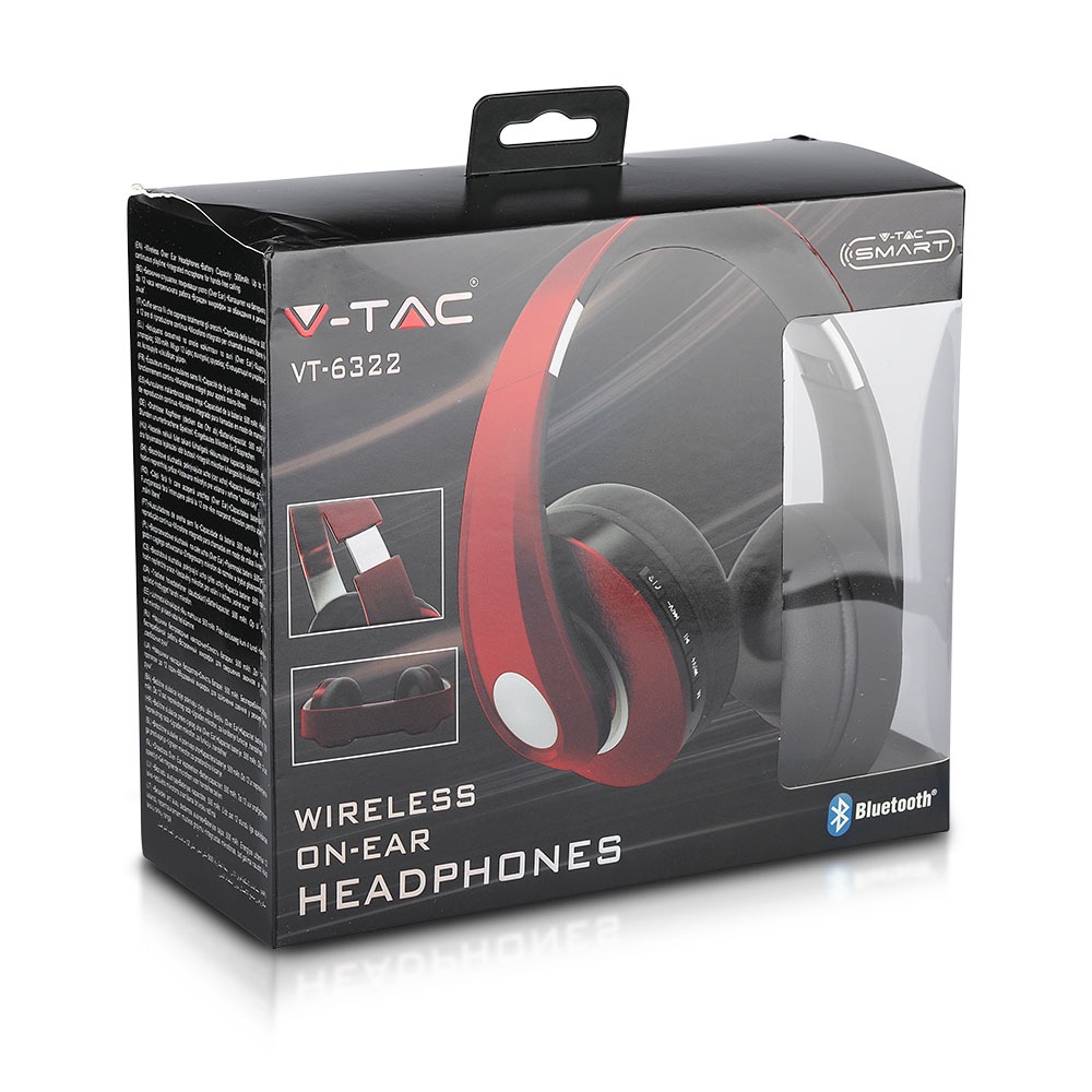 On-Ear Kopfhörer von V-TAC, Modell VT-6322-A-B. Diese Kopfhörer bieten eine komfortable Passform und sind ideal für den mobilen Einsatz. Sie verfügen über weiche, gepolsterte Ohrpolster, die Außengeräusche minimieren. Die Kopfhörer sind mit Bluetooth-Technologie kompatibel und ermöglichen eine kabellose Verbindung bis zu 10 Meter. Zusätzlich sind sie mit einem Mikrofon für Freisprechanrufe ausgestattet und werden mit einem Micro-USB-Kabel sowie einer Tragetasche geliefert.