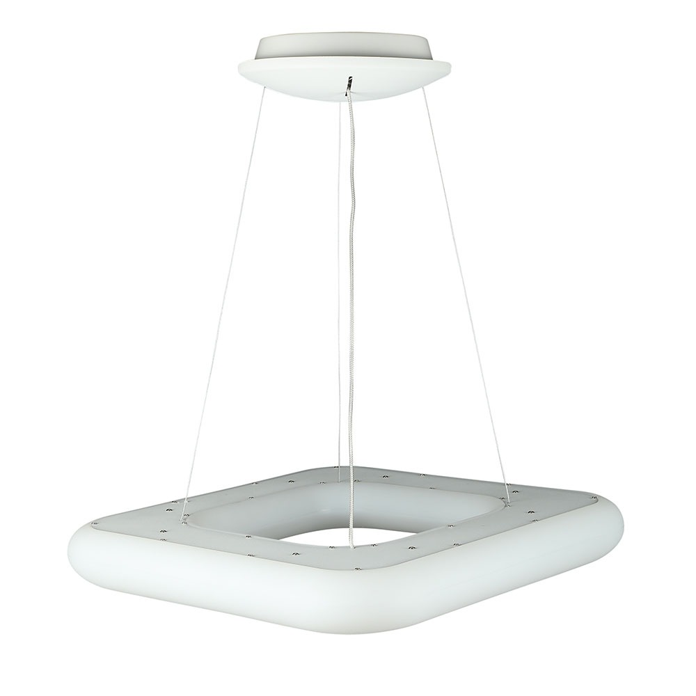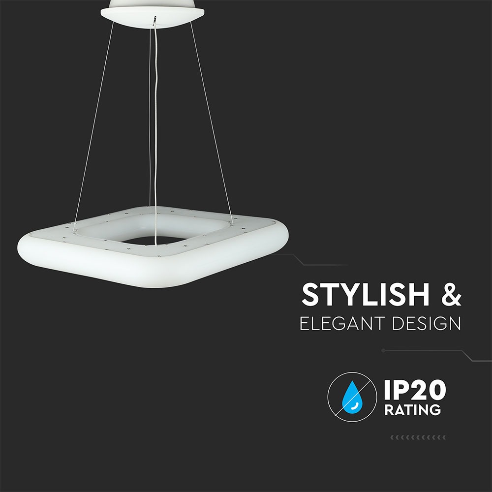 Pendelleuchte von V-TAC, Modell VT-7607, mit einer Leistung von 42 Watt, geeignet für moderne Innenräume. Sie bietet eine Lichtausbeute von 3400 Lumen, einen Farbwiedergabeindex von über 80 und einen Abstrahlwinkel von 120°. Die Lebensdauer beträgt 30.000 Stunden und die Leuchte ist mit einer Garantie von 3 Jahren ausgestattet. Die Maße betragen 140 mm in der Länge und 660 mm in der Breite und Höhe, das Gewicht liegt bei 3,8 kg. Die Montage erfolgt hängend. Die Leuchte bietet eine 3-in-1 Farbwechsel-Funktionalität und ist dimmbar über eine Fernbedienung.