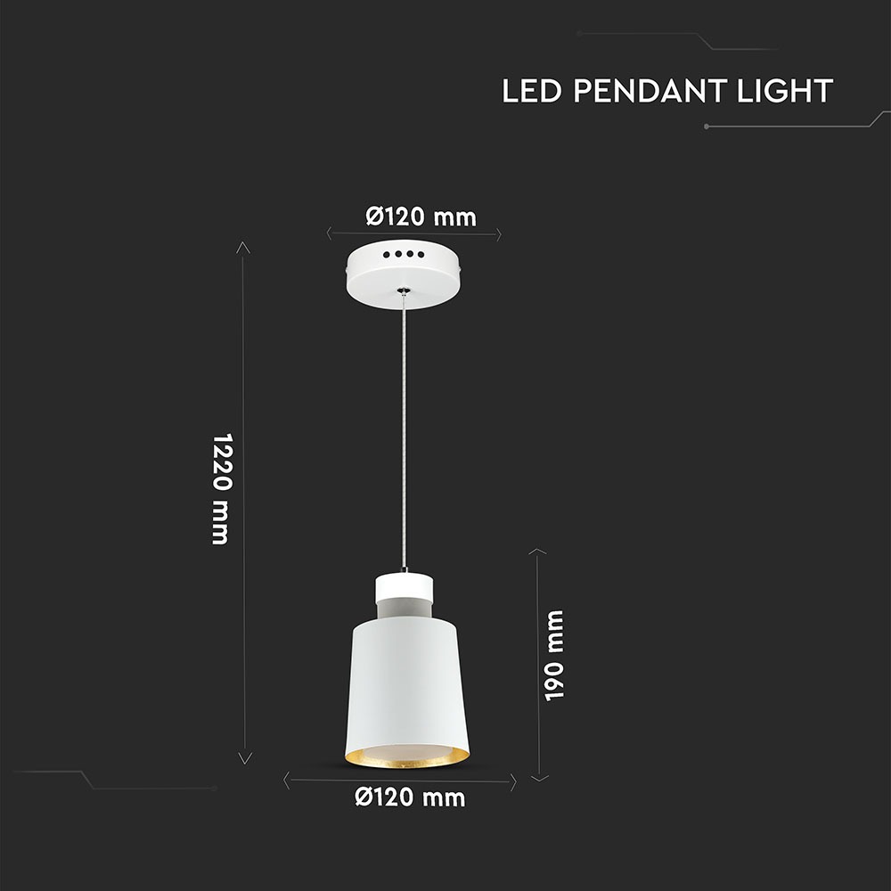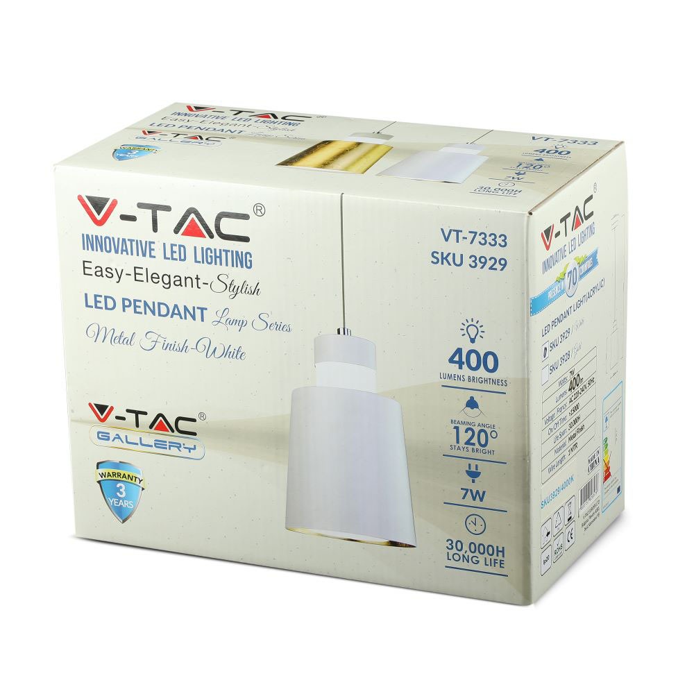 Pendelleuchte von V-TAC, Modell VT-7333-WH, mit einer Leistung von 7 Watt, ideal für den Einsatz in Wohnräumen, Restaurants und gewerblicher Beleuchtung. Sie bietet eine Lichtstärke von 400 Lumen, einen Farbwiedergabeindex von über 80 und einen Abstrahlwinkel von 120°. Die Lebensdauer beträgt 30.000 Stunden und die Leuchte ist mit einem IP20-Schutz ausgestattet. Die Maße betragen 240 mm in der Länge, 130 mm in der Breite und 190 mm in der Höhe bei einem Gewicht von 1,428 kg. Die Montage erfolgt hängend und die Leuchte überzeugt durch ihr elegantes Design in Weiß sowie ihre Energieeffizienz.
