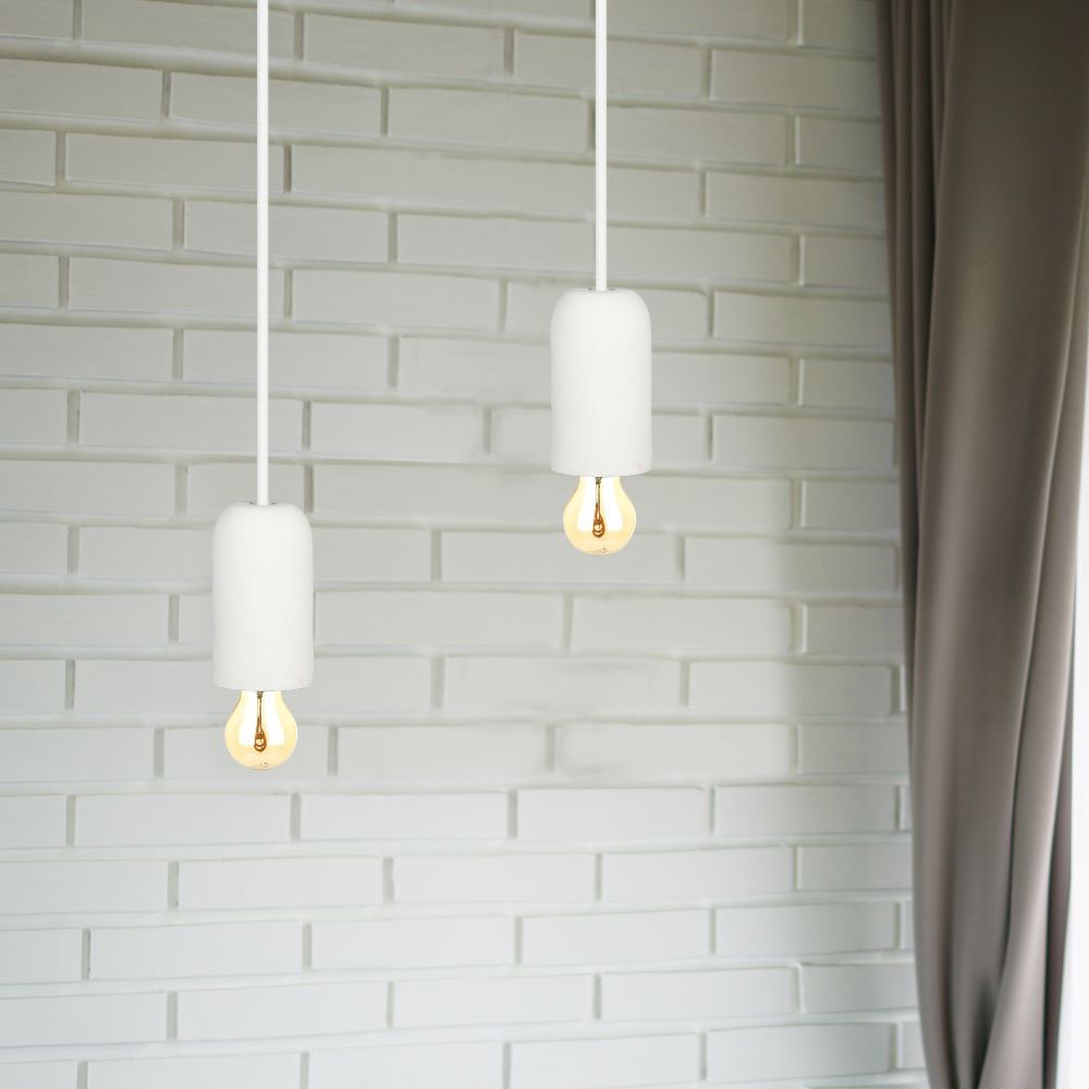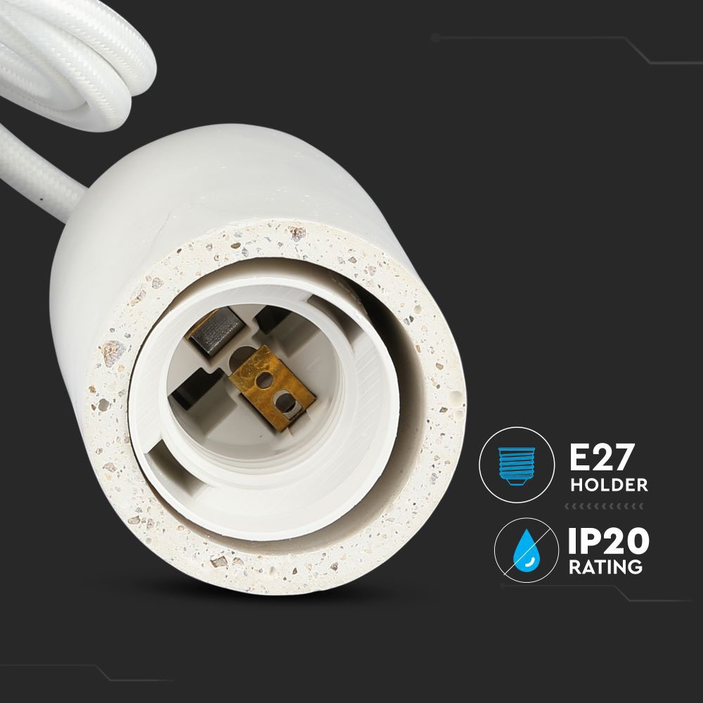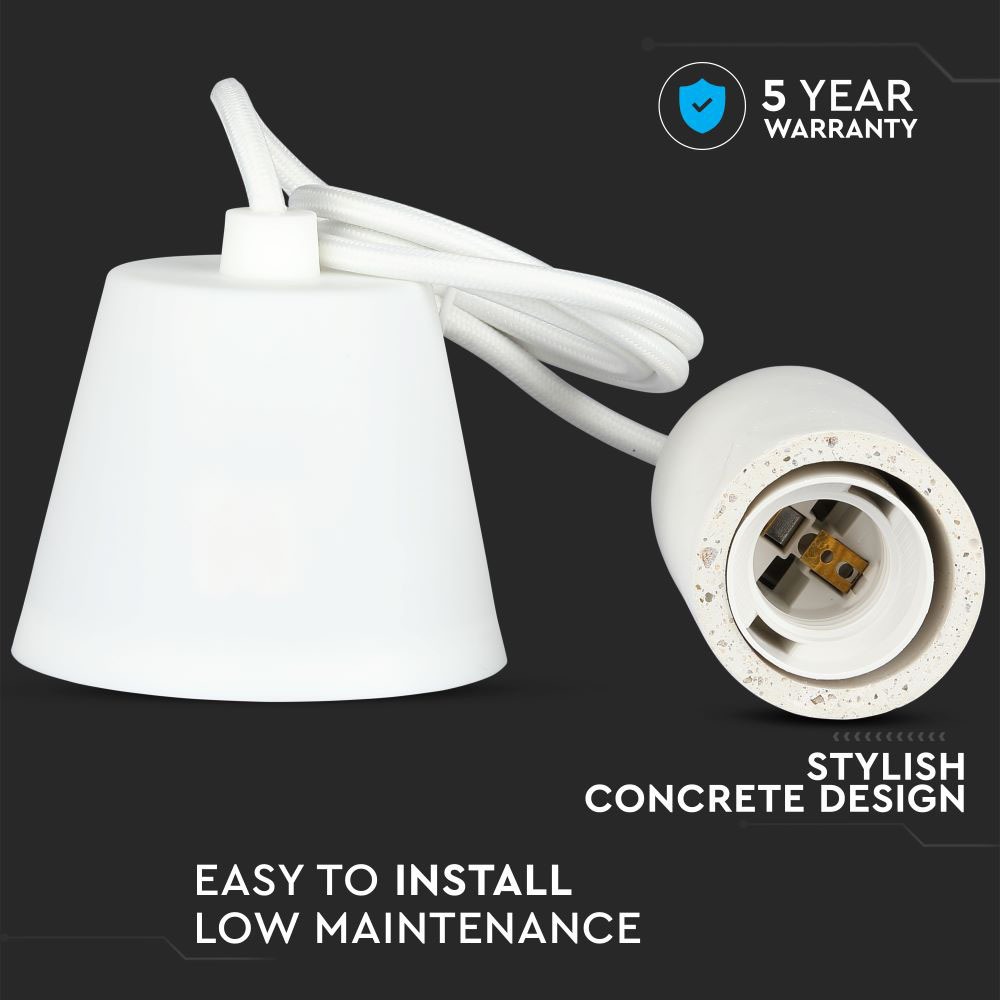 Pendelleuchte von V-TAC, Modell VT-7668-W, geeignet für moderne Innenräume. Die Leuchte hat eine maximale Belastbarkeit von 60 Watt und ist ideal für Hotels, Wohnräume, Restaurants und gewerbliche Beleuchtung. Die robuste und langlebige Bauweise aus Beton sorgt für Stabilität. Maße: 150mm x 100mm x 125mm, Gewicht: 0,38kg, Montageart: Abgehängt. Zeitgemäßes Design in eleganter weißer Farbgebung.