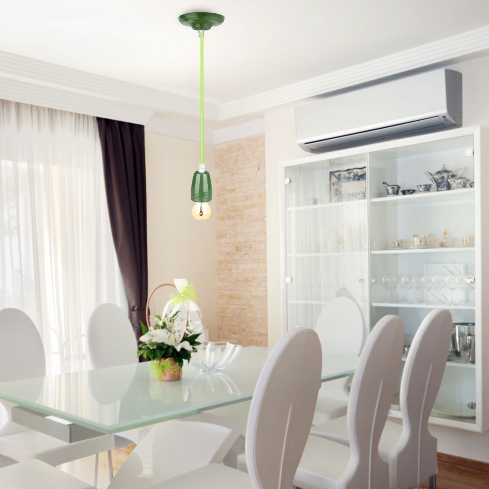 Pendelleuchte von V-TAC, Modell VT-7998-GN, geeignet für moderne Innenräume. Die Leuchte ist aus robustem Porzellan gefertigt und in elegantem Grün gehalten. Sie verfügt über einen E27 Sockel (Glühbirne nicht enthalten) und ist für eine maximale Leistung von 60 Watt ausgelegt. Die Abmessungen betragen 110 mm x 110 mm x 100 mm bei einem Gewicht von 0,4 kg. Diese Pendelleuchte eignet sich ideal für Hotels, Wohnräume, Restaurants und gewerbliche Beleuchtung.