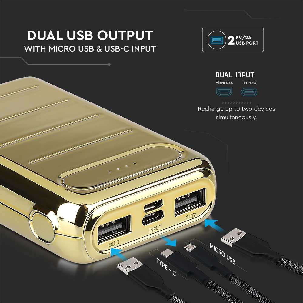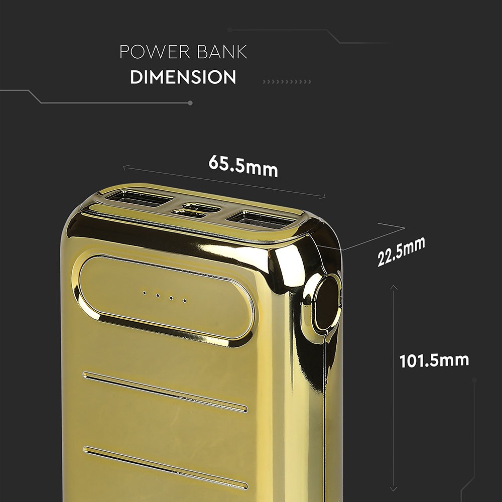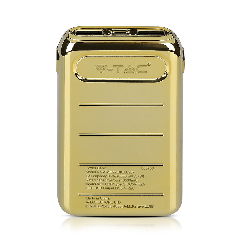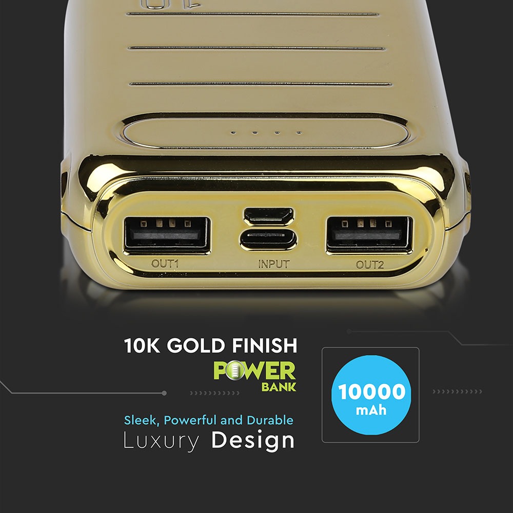 Power Bank von V-TAC, Modell VT-3522, mit 10000mAh Kapazität. Dieser tragbare Power Bank bietet eine Ausgangskapazität von 6500mAh und ist mit zwei USB-Anschlüssen für gleichzeitiges Laden ausgestattet. Die LED-Batterieanzeige informiert über den aktuellen Ladezustand. Maße: 100mm x 38mm x 200mm, Gewicht: 0,27kg. Enthält ein Ladekabel für die Power Bank. Eigenschaften: 10K Gold beschichtet, Dual-Eingang: USB Typ C und Micro-USB.